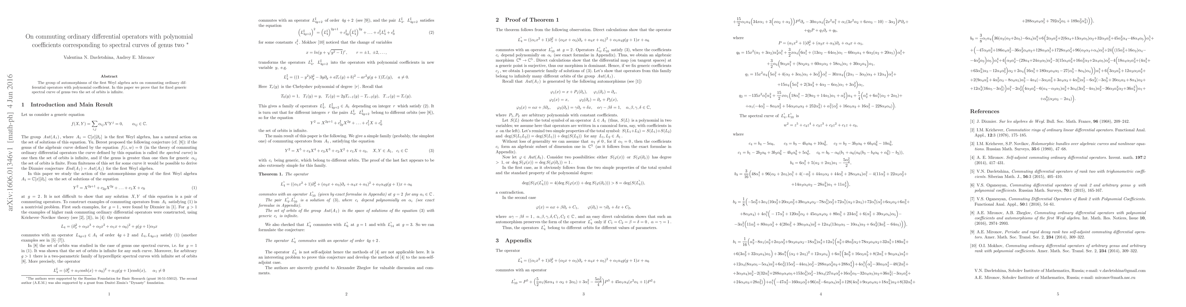 Summary: This paper investigates the action of the automorphism group of the first Weyl algebra on commuting differential operators with polynomial coefficients. It proves that for a fixed generic spectral curve of genus two, the set of orbits under this action is infinite.