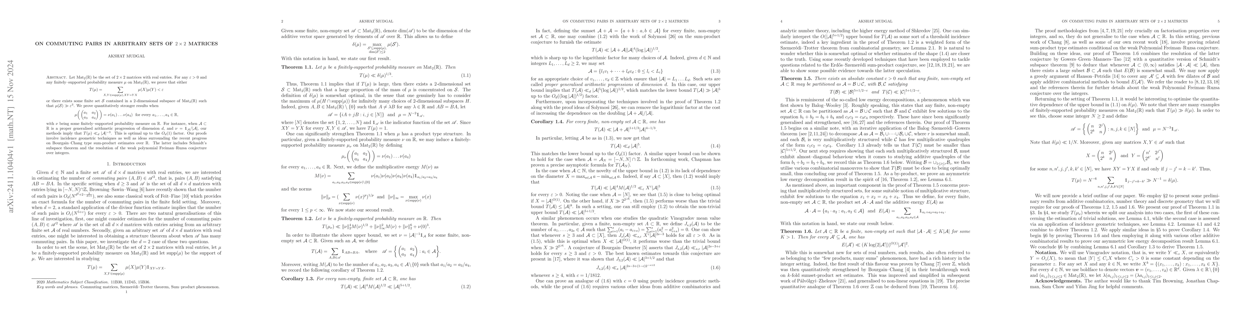 This paper proves that in a set of 2x2 real matrices, either a certain sum of commuting pairs is arbitrarily small, or a large subset exists within a 2-dimensional subspace. It leverages incidence geometry and recent sum-product estimates to achieve optimal bounds for generalised arithmetic progressions.