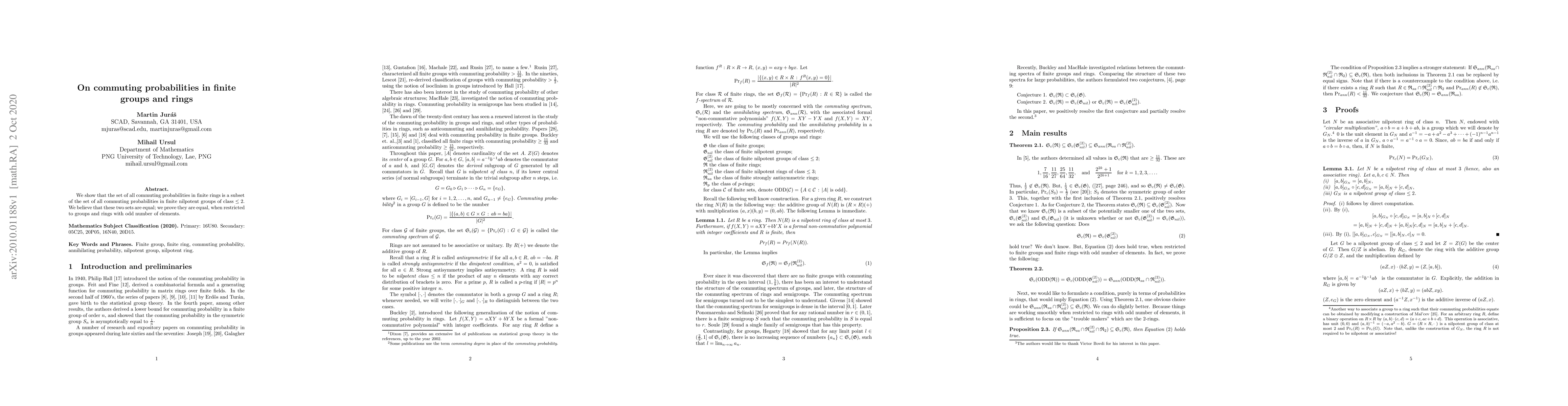 Researchers show that commuting probabilities in finite rings are a subset of those in finite nilpotent groups of class ≤2, with equality proven for odd-numbered elements.