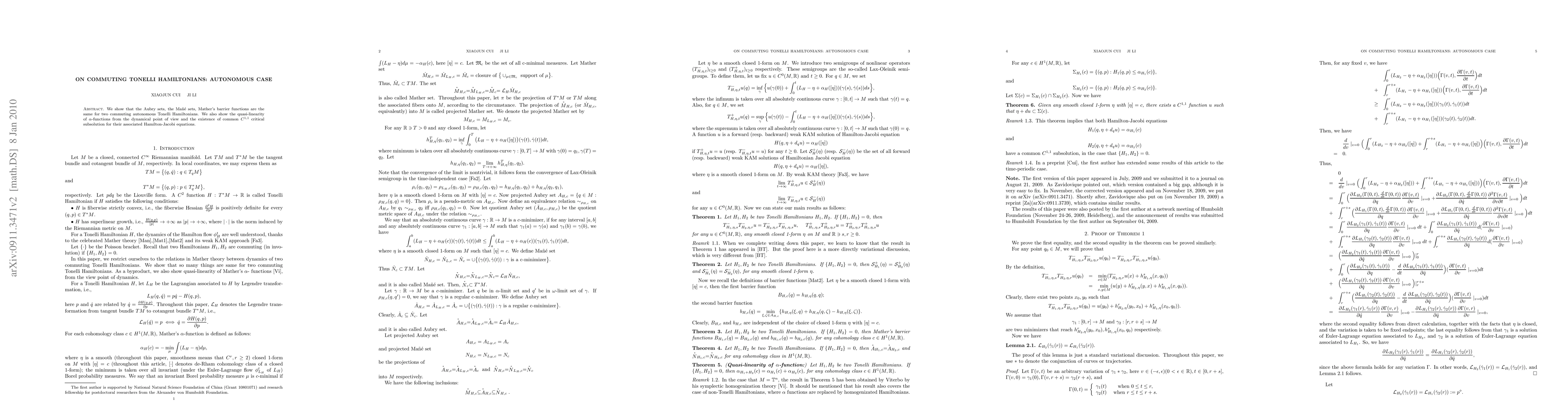 We show that the Aubry sets, the Ma\~{n}\'{e} sets, Mather's barrier functions are the same for two commuting autonomous Tonelli Hamiltonians. We also show the quasi-linearity of $\alpha$-functions from the dynamical point of view and the existence of common $C^{1,1}$ critical subsolution for their associated Hamilton-Jacobi equations.