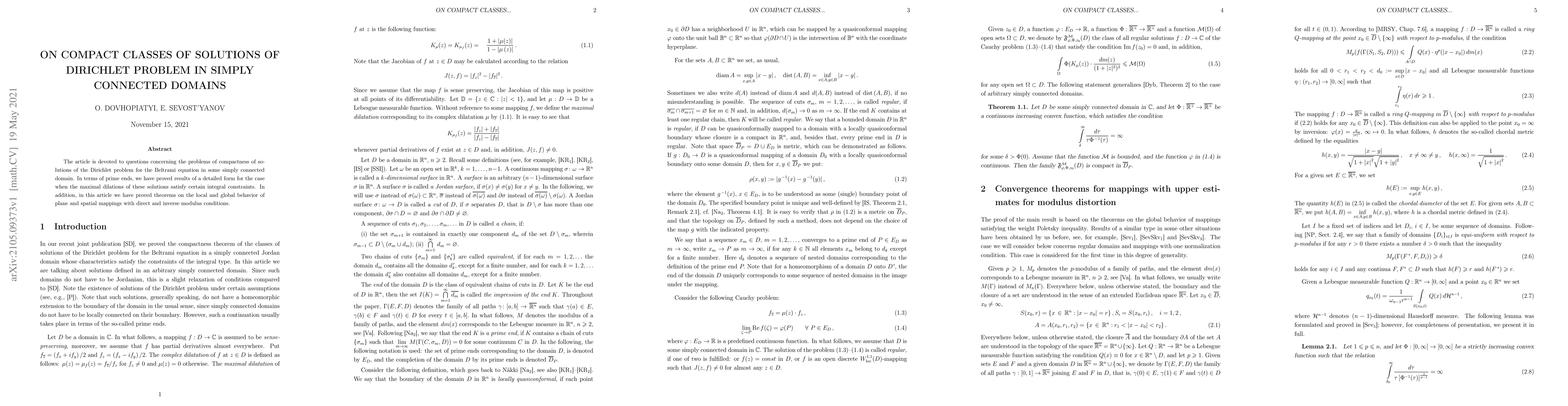 The article is devoted to questions concerning the problems of compactness of solutions of the Dirichlet problem for the Beltrami equation in some simply connected domain. In terms of prime ends, we have proved results of a detailed form for the case when the maximal dilations of these solutions satisfy certain integral constraints. In addition, in this article we have proved theorems on the local and global behavior of plane and spatial mappings with direct and inverse modulus conditions.