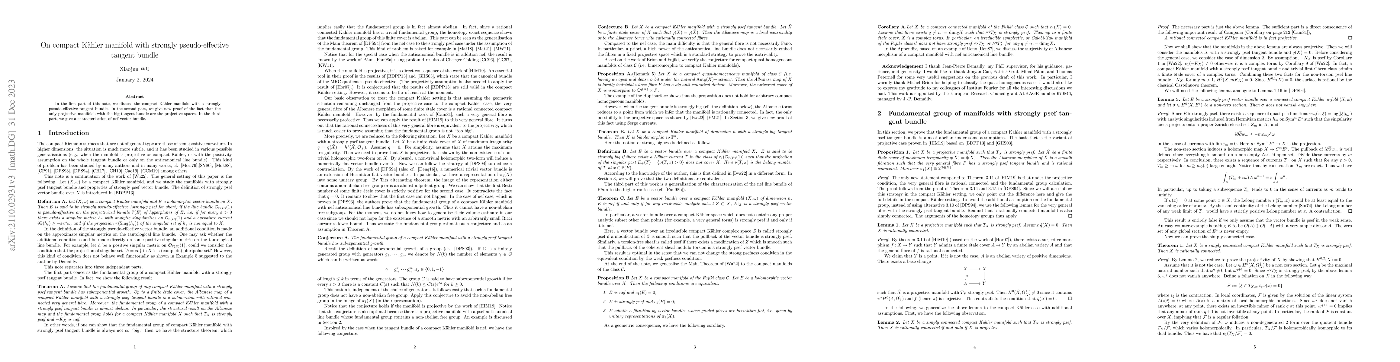 In the first part of this note, we discuss the compact K\"ahler manifold with a strongly pseudo-effective tangent bundle. In the second part, we give new proof of the fact that the only projective manifolds with the big tangent bundle are the projective spaces. In the third part, we give a characterisation of nef vector bundle.