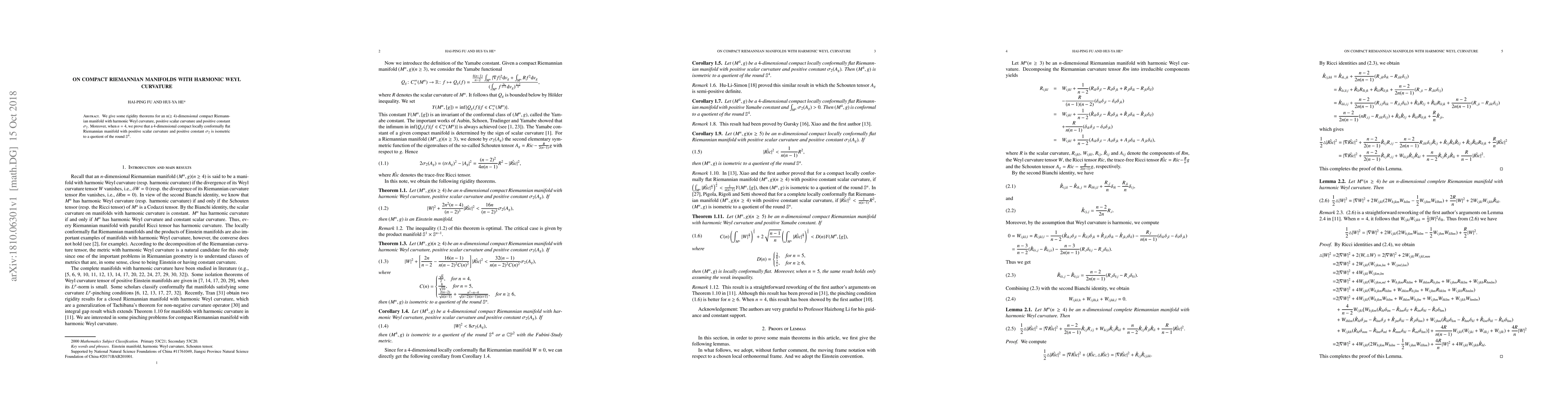 We give some rigidity theorems for an n$(\geq4)$-dimensional compact Riemannian manifold with harmonic Weyl curvature, positive scalar curvature and positive constant $\sigma_2$. Moreover, when $n=4,$ we prove that a 4-dimensional compact locally conformally flat Riemannian manifold with positive scalar curvature and positive constant $\sigma_2$ is isometric to a quotient of the round $\mathbb{S}^4$.