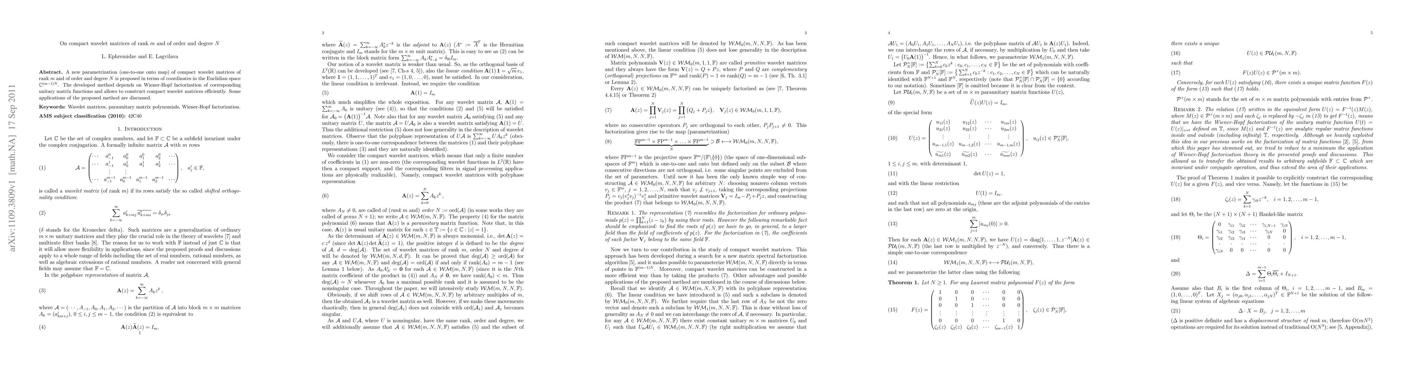 A new parametrization (one-to-one onto map) of compact wavelet matrices of rank $m$ and of order and degree $N$ is proposed in terms of coordinates in the Euclidian space $R^{(m-1)N}$. The developed method depends on Wiener-Hopf factorization of corresponding unitary matrix functions and allows to construct compact wavelet matrices efficiently. Some applications of the proposed method are discussed.