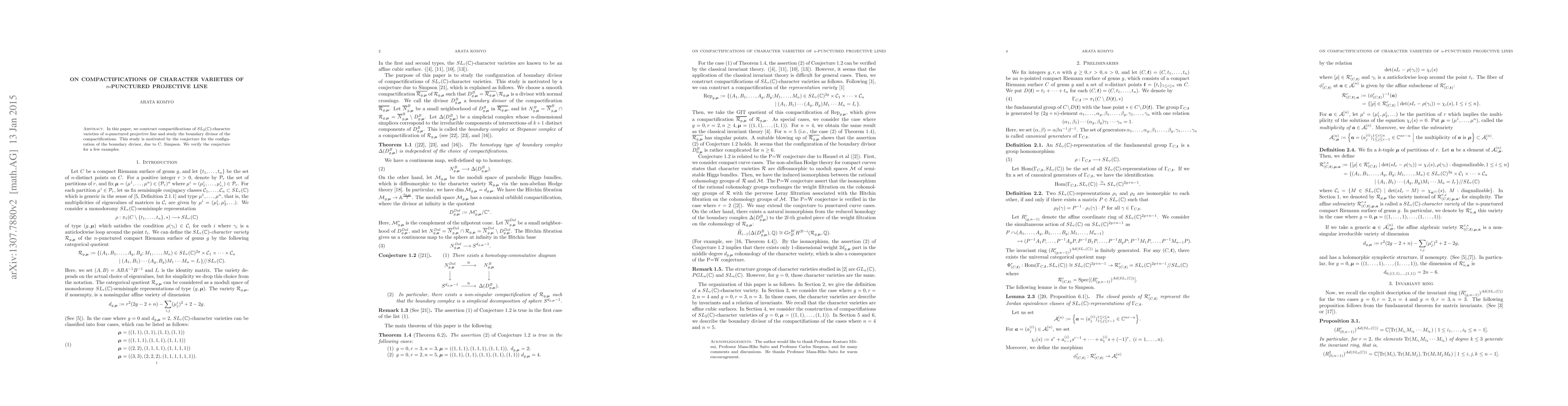 This paper constructs compactifications of $SL_2(\mathbb{C})$-character varieties for $n$-punctured projective lines and investigates their boundary divisors, verifying C. Simpson's conjecture for certain examples.