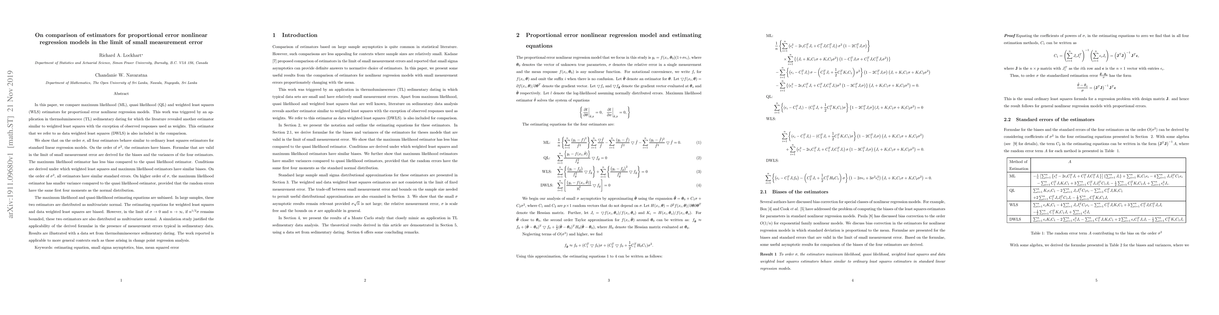 In this paper, we compare maximum likelihood (ML), quasi likelihood (QL) and weighted least squares (WLS) estimators for proportional error nonlinear regression models. Literature on thermoluminescence sedimentary dating revealed another estimator similar to weighted least squares but observed responses used as weights. This estimator that we refer to as data weighted least squares (DWLS) is also included in the comparison. We show that on the order $\sigma, $ all four estimators behave similar to ordinary least squares estimators for standard linear regression models. On the order of $\sigma^2, $ the estimators have biases. Formulae that are valid in the limit of small measurement error are derived for the biases and the variances of the four estimators. The maximum likelihood estimator has less bias compared to the quasi likelihood estimator. Conditions are derived under which weighted least squares and maximum likelihood estimators have similar biases. On the order of $\sigma^ {2} $, all estimators have similar standard errors. On higher order of $\sigma$, maximum likelihood estimator has smaller variance compared to quasi likelihood estimator, provided that the random errors have the same first four moments as the normal distribution. The maximum likelihood and quasi-likelihood estimating equations are unbiased. In large samples, these two estimators are distributed as multivariate normal. The estimating equations for weighted least squares and data weighted least squares are biased. However, in the limit of $\sigma \to 0$ and $n \to \infty, $ if $ n^ {1/2} \sigma$ remains bounded, these two estimators are also distributed as multivariate normal. A simulation study justified the applicability of the derived formulae in the presence of measurement errors typical in sedimentary data. Results are illustrated with a data set from thermoluminescence sedimentary dating.