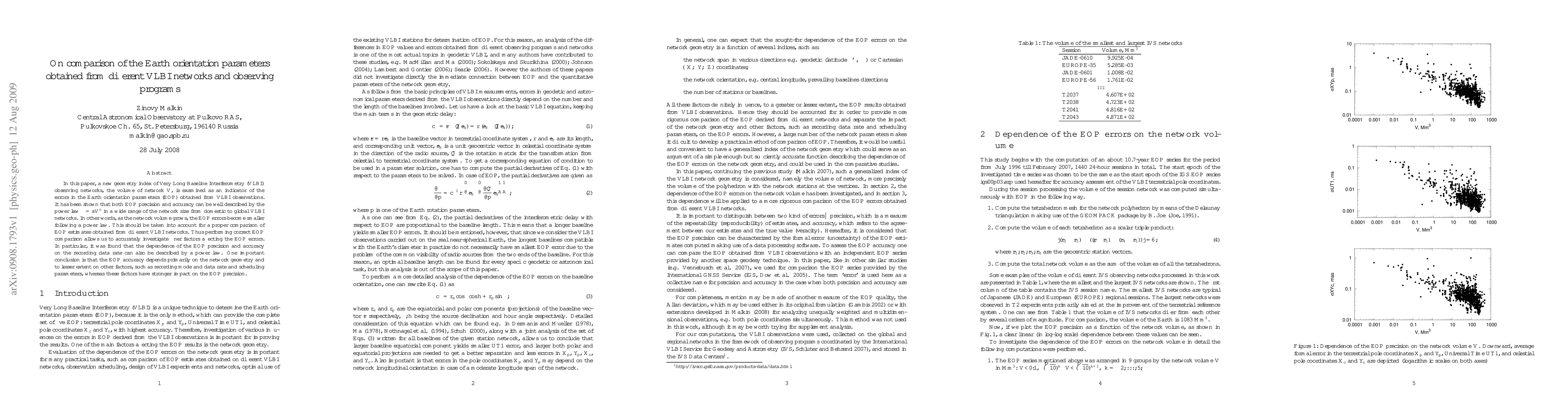 In this paper, a new geometry index of Very Long Baseline Interferometry (VLBI) observing networks, the volume of network $V$, is examined as an indicator of the errors in the Earth orientation parameters (EOP) obtained from VLBI observations. It has been shown that both EOP precision and accuracy can be well described by the power law $\sigma=aV^c$ in a wide range of the network size from domestic to global VLBI networks. In other words, as the network volume grows, the EOP errors become smaller following a power law. This should be taken into account for a proper comparison of EOP estimates obtained from different VLBI networks. Thus performing correct EOP comparison allows us to accurately investigate finer factors affecting the EOP errors. In particular, it was found that the dependence of the EOP precision and accuracy on the recording data rate can also be described by a power law. One important conclusion is that the EOP accuracy depends primarily on the network geometry and to lesser extent on other factors, such as recording mode and data rate and scheduling parameters, whereas these factors have stronger impact on the EOP precision.