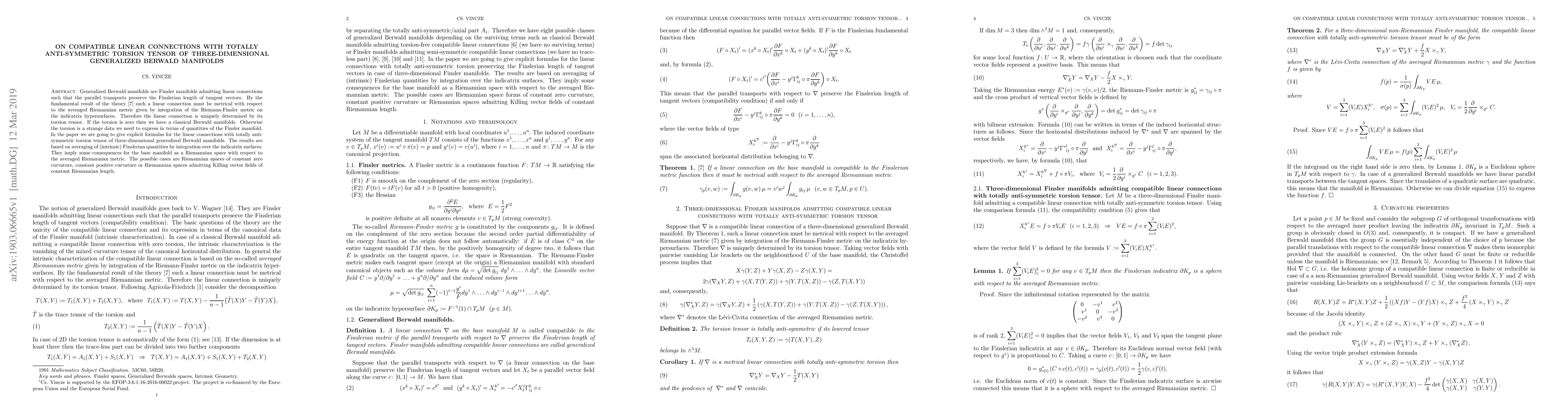 Generalized Berwald manifolds are Finsler manifolds admitting linear connections such that the parallel transports preserve the Finslerian length of tangent vectors. By the fundamental result of the theory \cite{V5} such a linear connection must be metrical with respect to the averaged Riemannian metric given by integration of the Riemann-Finsler metric on the indicatrix hypersurfaces. Therefore the linear connection is uniquely determined by its torsion tensor. If the torsion is zero then we have a classical Berwald manifolds. Otherwise the torsion is a strange data we need to express in terms of quantities of the Finsler manifold. In the paper we are going to give explicit formulas for the linear connections with totally anti-symmetric torsion tensor of three-dimensional generalized Berwald manifolds. The results are based on averaging of (intrinsic) Finslerian quantities by integration over the indicatrix surfaces. They imply some consequences for the base manifold as a Riemannian space with respect to the averaged Riemannian metric. The possible cases are Riemannian spaces of constant zero curvature, constant positive curvature or Riemannian spaces admitting Killing vector fields of constant Riemannian length.