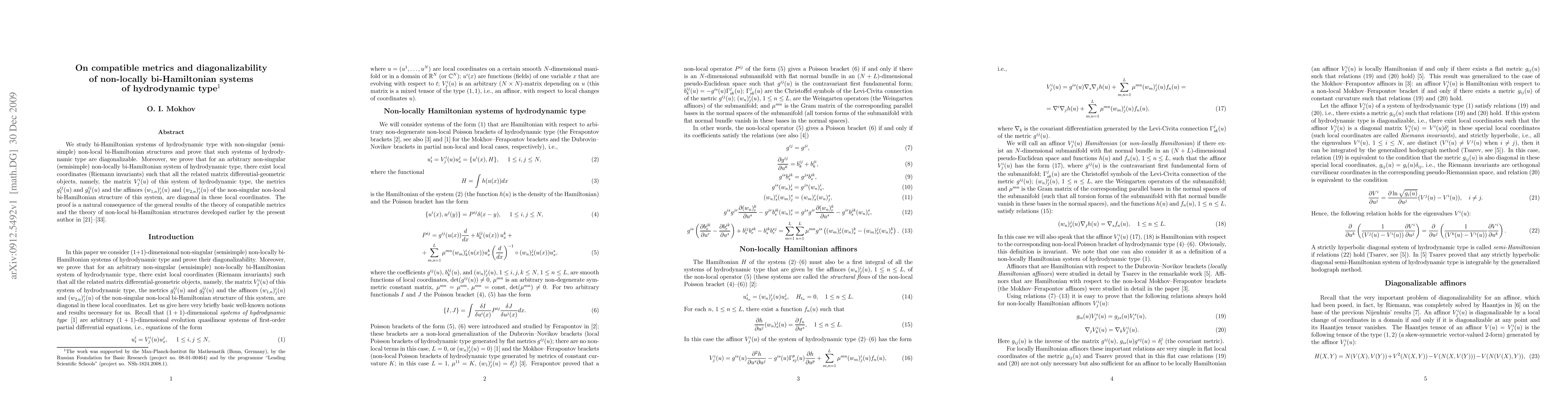 This paper explores bi-Hamiltonian systems of hydrodynamic type with non-local bi-Hamiltonian structures, proving their diagonalizability and existence of local coordinates where related matrix objects become diagonal. The findings rely on the theory of compatible metrics and non-local bi-Hamiltonian structures.