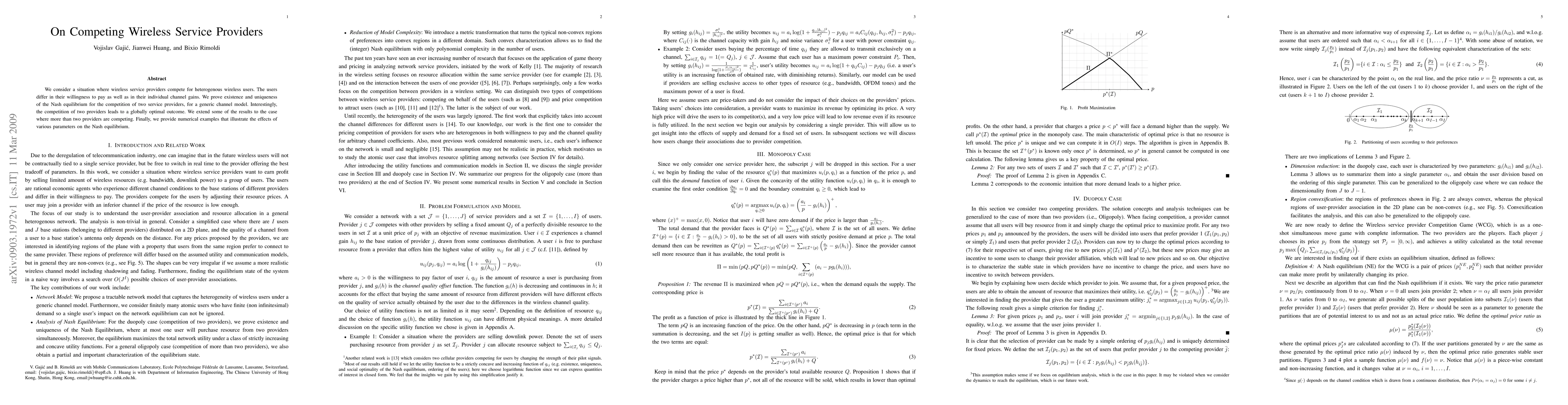 This paper examines the competition between wireless service providers for heterogeneous users, proving the existence and uniqueness of the Nash equilibrium for two providers under a generic channel model. It finds that competition between two providers results in a globally optimal outcome and extends findings to scenarios with more than two providers, supplemented by numerical examples.