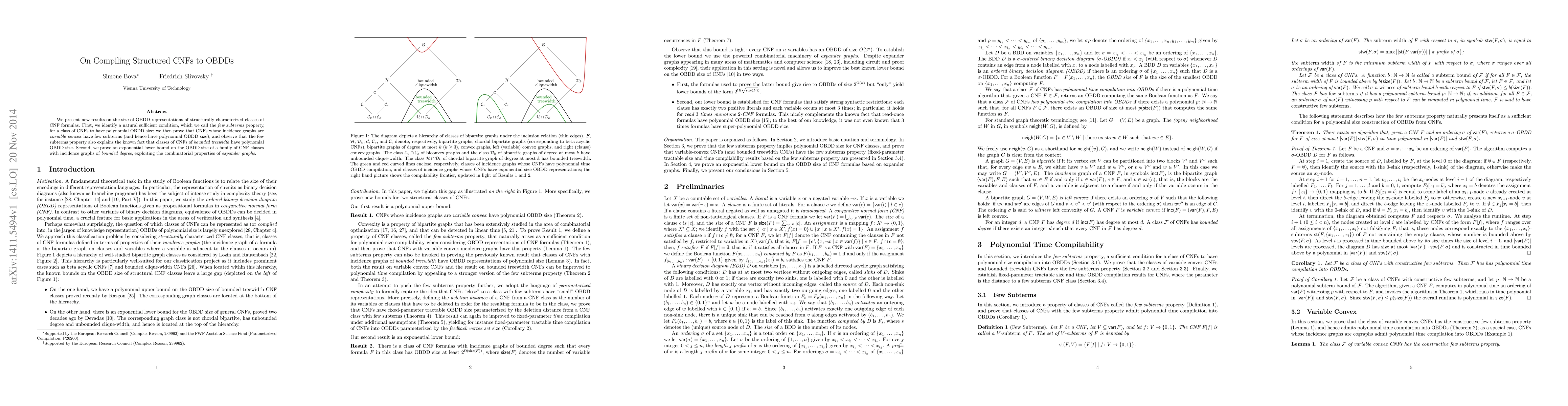 We present new results on the size of OBDD representations of structurally characterized classes of CNF formulas. First, we identify a natural sufficient condition, which we call the few subterms property, for a class of CNFs to have polynomial OBDD size; we then prove that CNFs whose incidence graphs are variable convex have few subterms (and hence have polynomial OBDD size), and observe that the few subterms property also explains the known fact that classes of CNFs of bounded treewidth have polynomial OBDD size. Second, we prove an exponential lower bound on the OBDD size of a family of CNF classes with incidence graphs of bounded degree, exploiting the combinatorial properties of expander graphs.
