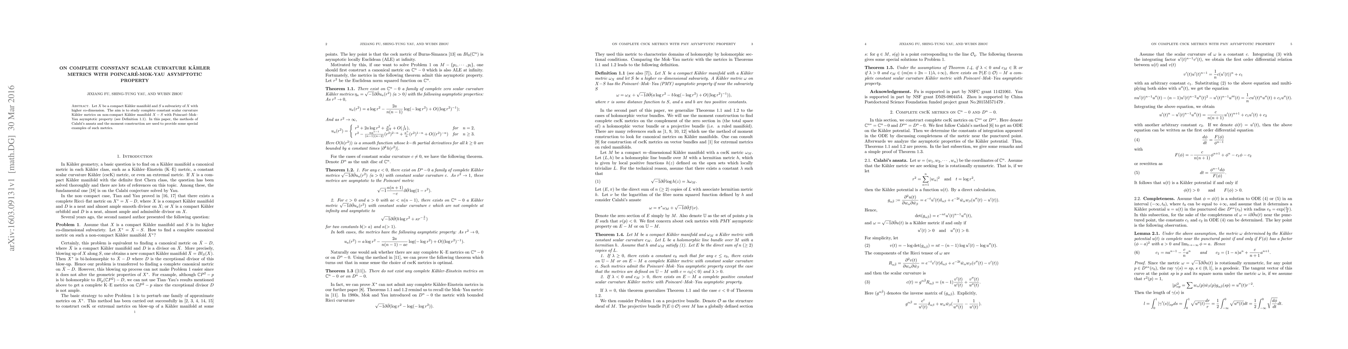 This paper investigates complete constant scalar curvature Kähler metrics on non-compact Kähler manifolds formed by removing a subvariety from a compact Kähler manifold. It employs Calabi's ansatz and moment construction to demonstrate specific examples of metrics with the Poincaré-Mok-Yau asymptotic property.