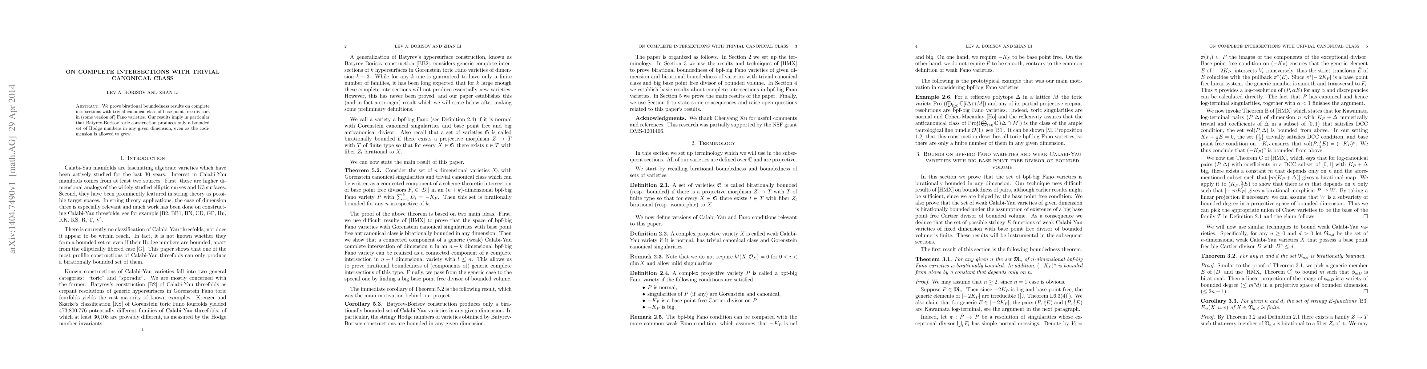 Summary: This paper proves birational boundedness for complete intersections with trivial canonical class in Fano varieties, showing that Batyrev-Borisov toric constructions yield a bounded set of Hodge numbers across dimensions, regardless of codimension.