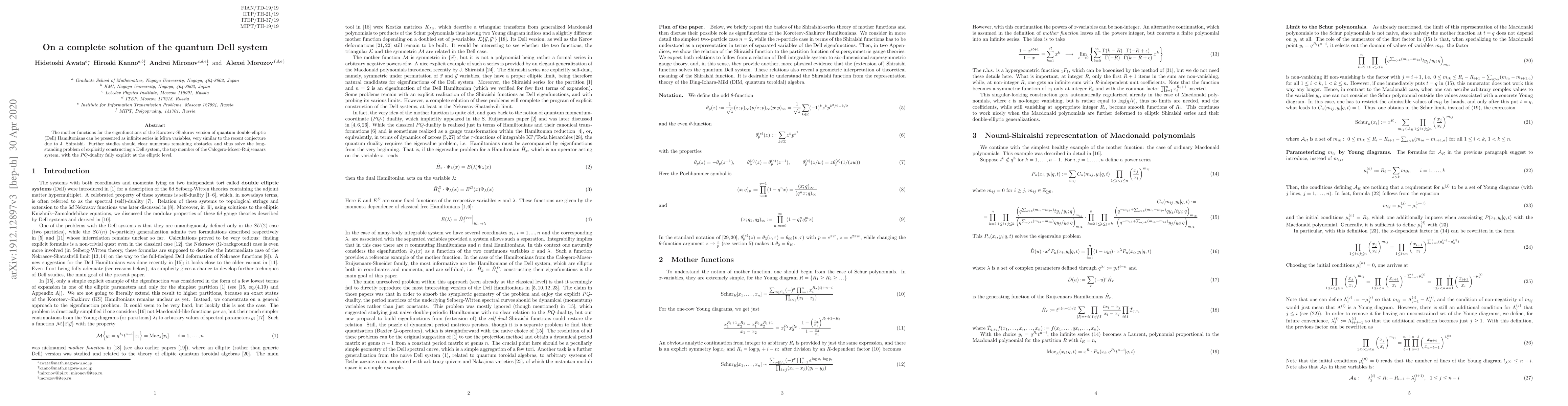 The mother functions for the eigenfunctions of the Koroteev-Shakirov version of quantum double-elliptic (Dell) Hamiltonians can be presented as infinite series in Miwa variables, very similar to the recent conjecture due to J. Shiraishi. Further studies should clear numerous remaining obstacles and thus solve the long-standing problem of explicitly constructing a Dell system, the top member of the Calogero-Moser-Ruijsenaars system, with the $PQ$-duality fully explicit at the elliptic level.