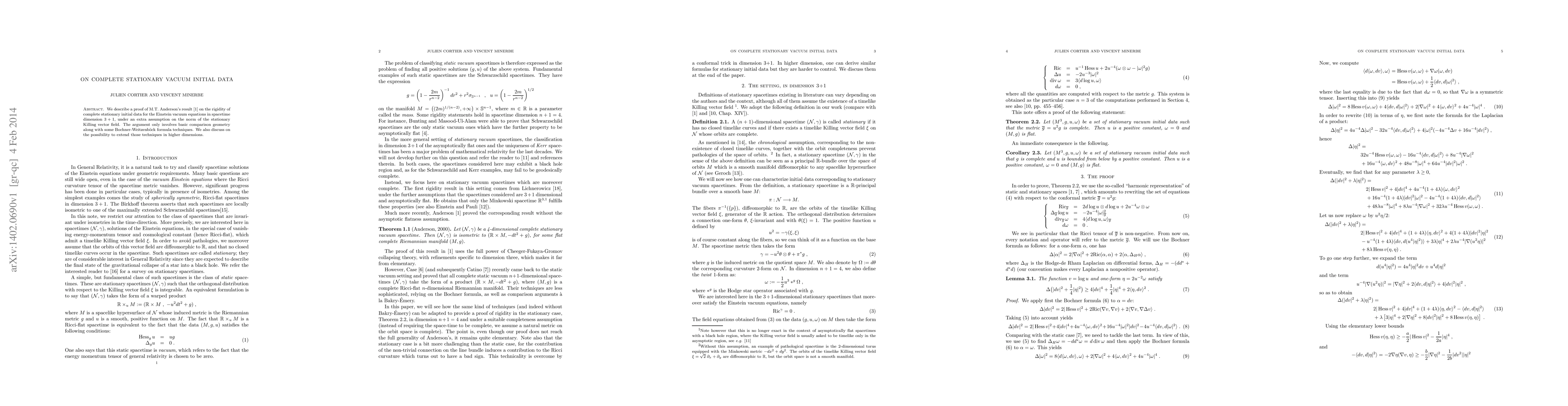We describe a proof of M.T. Anderson's result on the rigidity of complete stationary initial data for the Einstein vacuum equations in spacetime dimension 3 + 1, under an extra assumption on the norm of the stationary Killing vector field. The argument only involves basic comparison geometry along with some Bochner-Weitzenb\"ock formula techniques. We also discuss on the possibility to extend those techniques in higher dimensions.