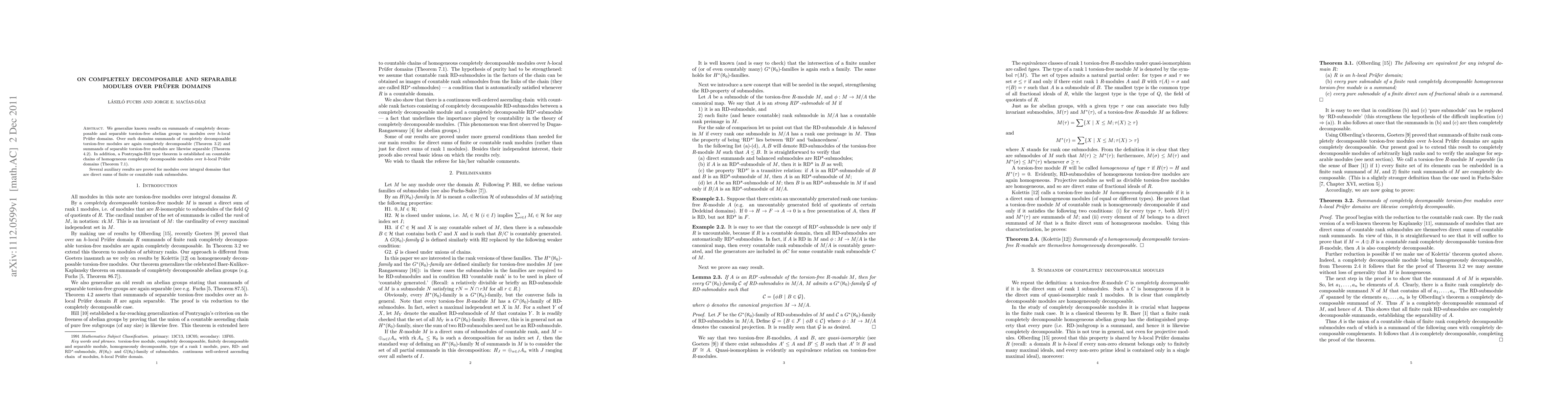 This paper generalizes results on torsion-free abelian groups to modules over h-local Pr\"ufer domains, proving that summands of completely decomposable modules remain completely decomposable, and summands of separable modules remain separable. It also establishes a Pontryagin-Hill type theorem for countable chains of homogeneous modules.
