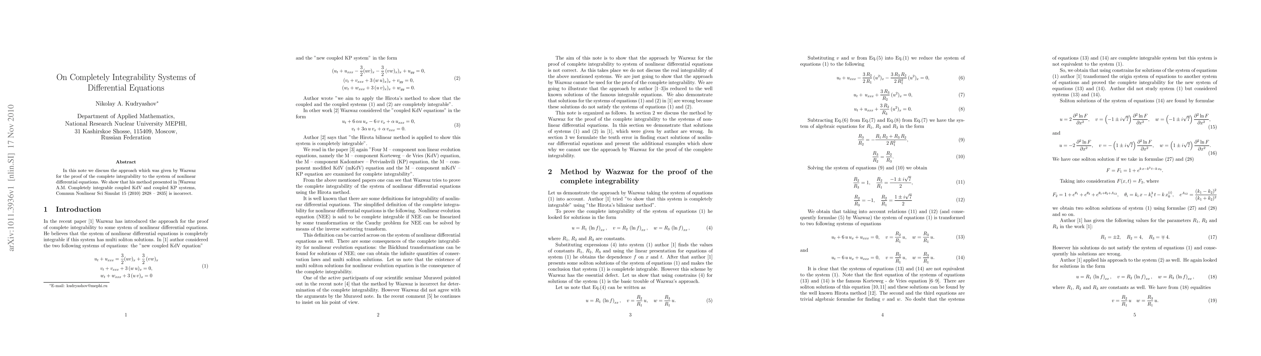 In this note we discuss the approach which was given by Wazwaz for the proof of the complete integrability to the system of nonlinear differential equations. We show that his method presented in [Wazwaz A.M. Completely integrable coupled KdV and coupled KP systems, Commun Nonlinear Sci Simulat 15 (2010) 2828-2835] is incorrect.