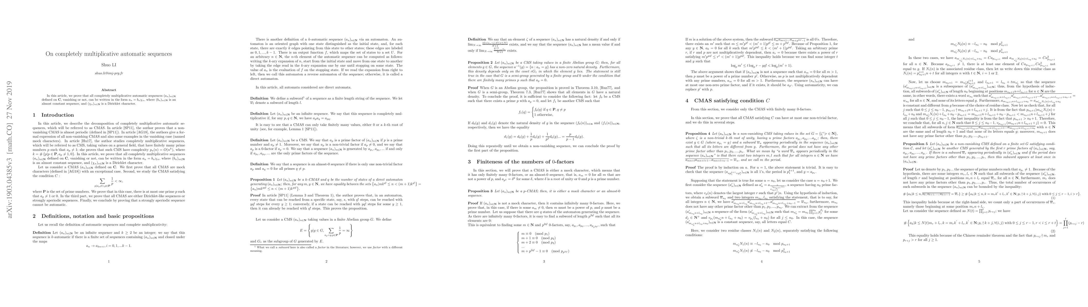 This paper proves that any completely multiplicative automatic sequence can be expressed as the product of an almost constant sequence and a Dirichlet character. The result holds for all such sequences defined on the complex numbers.