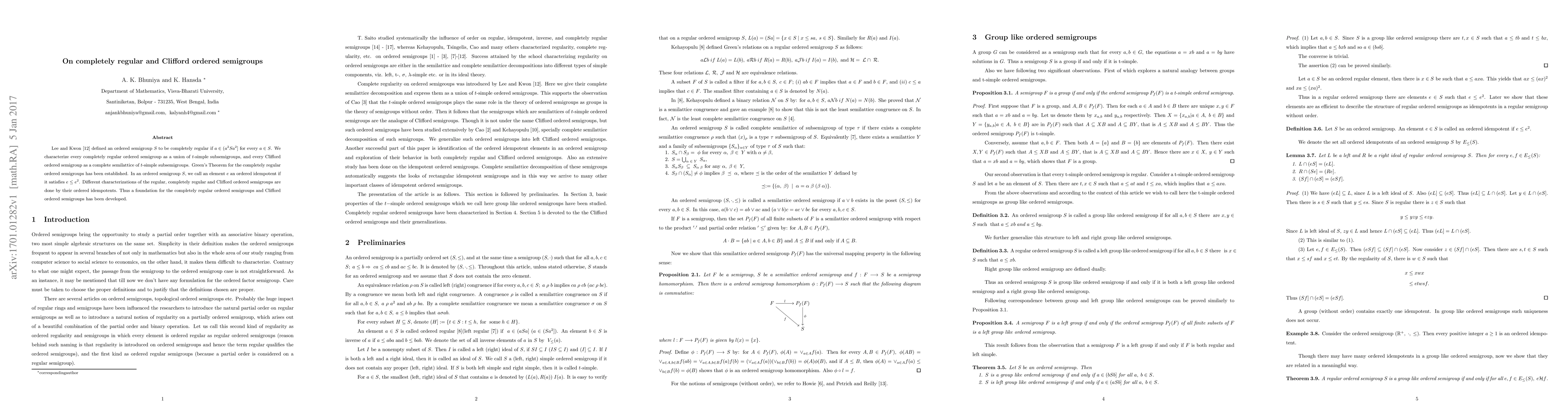 This paper characterizes completely regular and Clifford ordered semigroups, showing that completely regular ones are unions of t-simple subsemigroups, while Clifford ordered semigroups are complete semilattices of such subsemigroups. It also establishes Green's Theorem for completely regular ordered semigroups and explores different characterizations of these semigroups through their ordered idempotents.