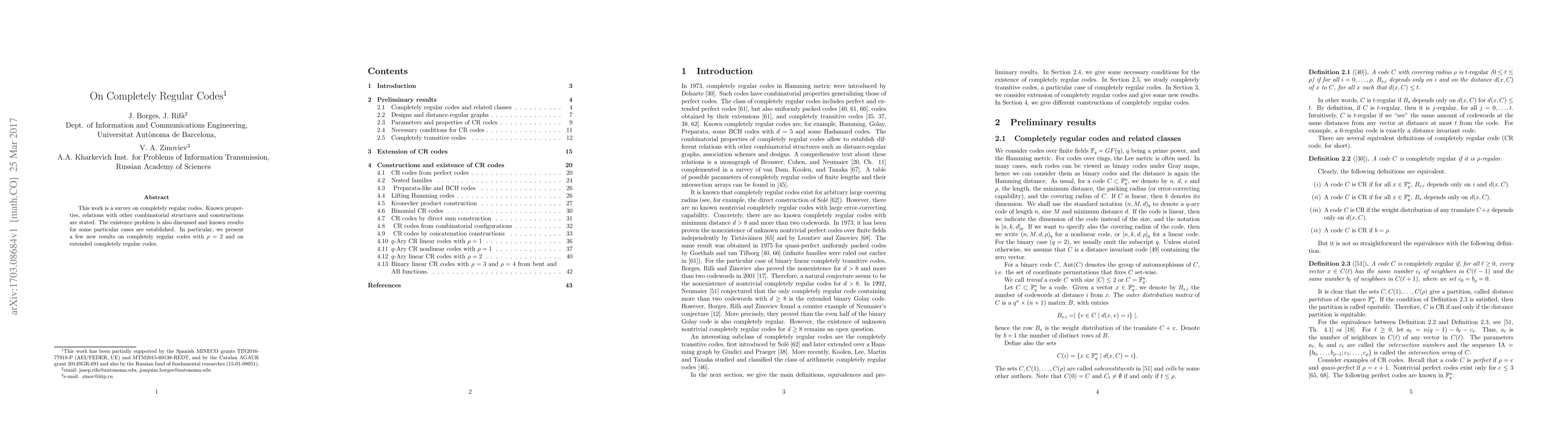This paper surveys completely regular codes, detailing their properties, relations with other combinatorial structures, and constructions. It discusses the existence problem and presents new results on codes with covering radius 2 and extended completely regular codes.