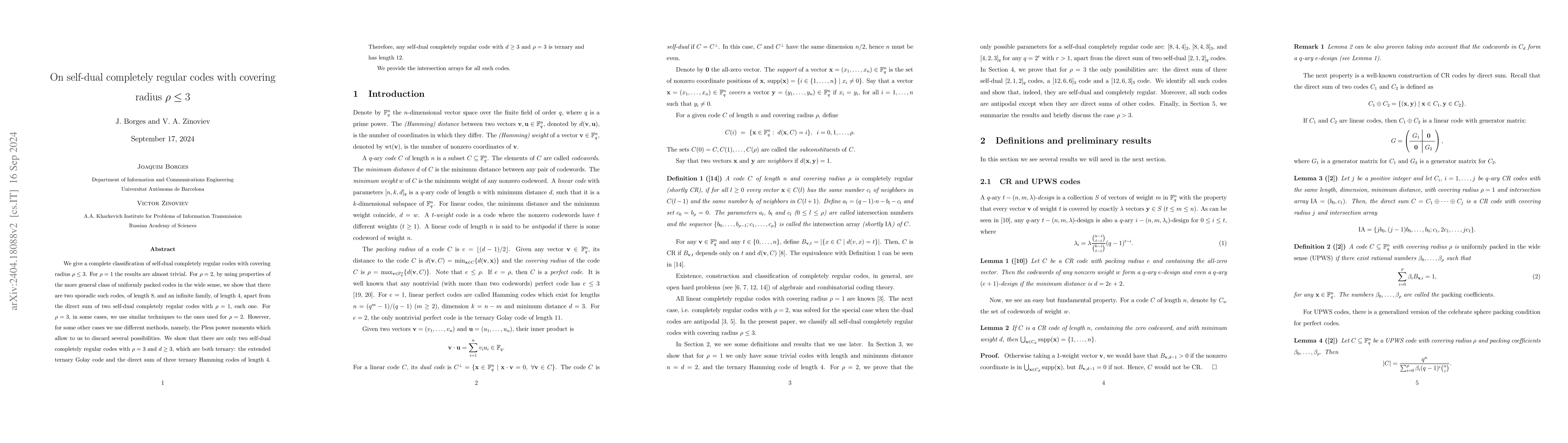 The paper introduces detailed methods for classifying self-dual CR codes using weight distributions and intersection arrays, along with proofs of nonexistence for certain code parameters.