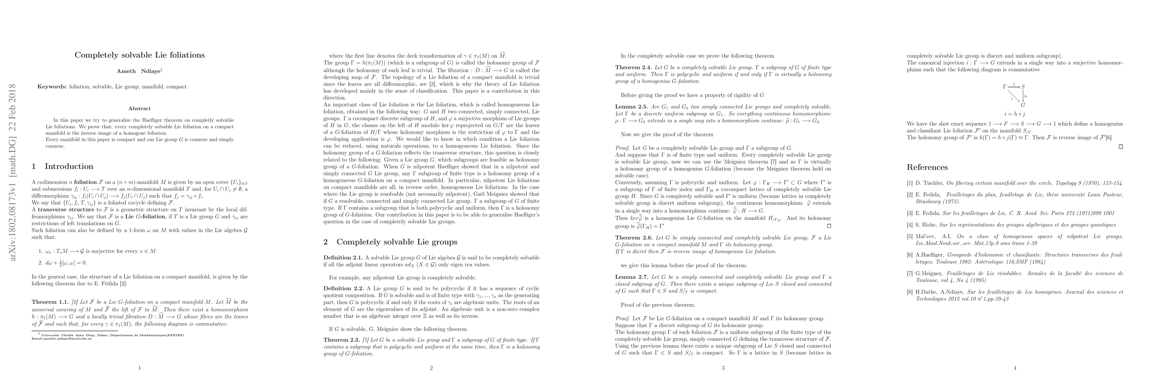 In this paper we try to generalize the Haefliger theorem on completly solvable Lie foliations. We prove that: every completely solvable Lie foliation on a compact manifold is the inverse image of a homogenus foliation. Every manifold in this paper is compact and our Lie group G is connexe and simply connexe.