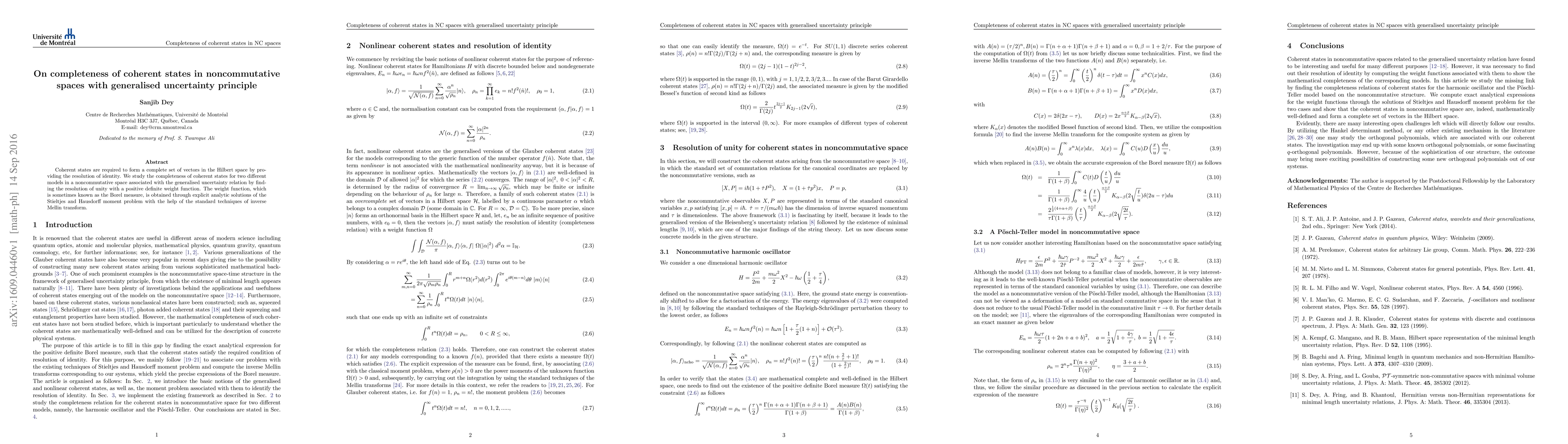 Coherent states are required to form a complete set of vectors in the Hilbert space by providing the resolution of identity. We study the completeness of coherent states for two different models in a noncommutative space associated with the generalised uncertainty relation by finding the resolution of unity with a positive definite weight function. The weight function, which is sometimes known as the Borel measure, is obtained through explicit analytic solutions of the Stieltjes and Hausdorff moment problem with the help of the standard techniques of inverse Mellin transform.