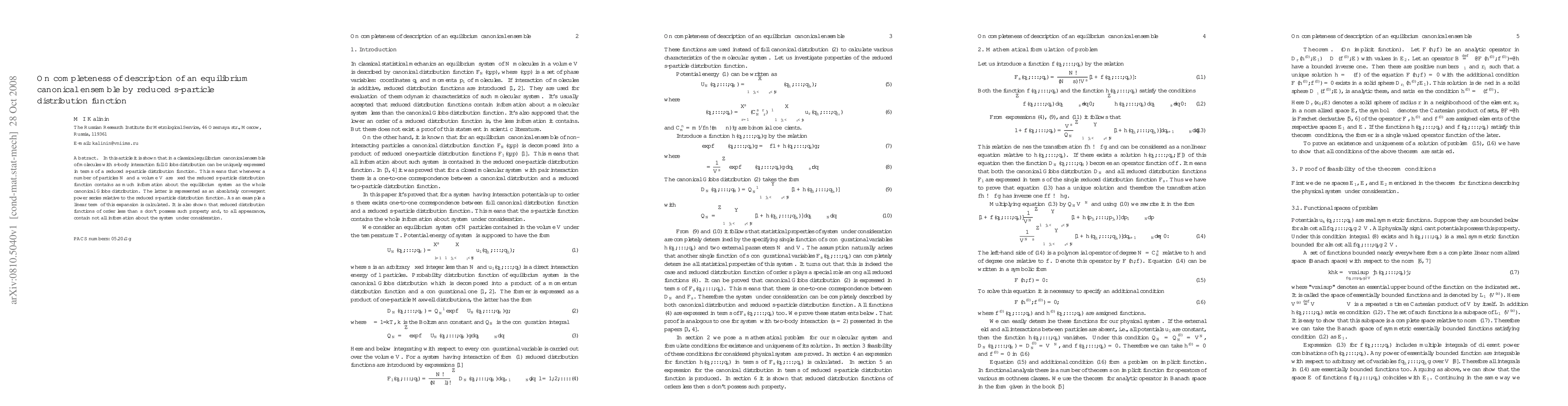 In this article it is shown that in a classical equilibrium canonical ensemble of molecules with $s$-body interaction full Gibbs distribution can be uniquely expressed in terms of a reduced s-particle distribution function. This means that whenever a number of particles $N$ and a volume $V$ are fixed the reduced $s$-particle distribution function contains as much information about the equilibrium system as the whole canonical Gibbs distribution. The latter is represented as an absolutely convergent power series relative to the reduced $s$-particle distribution function. As an example a linear term of this expansion is calculated. It is also shown that reduced distribution functions of order less than $s$ don't possess such property and, to all appearance, contain not all information about the system under consideration.