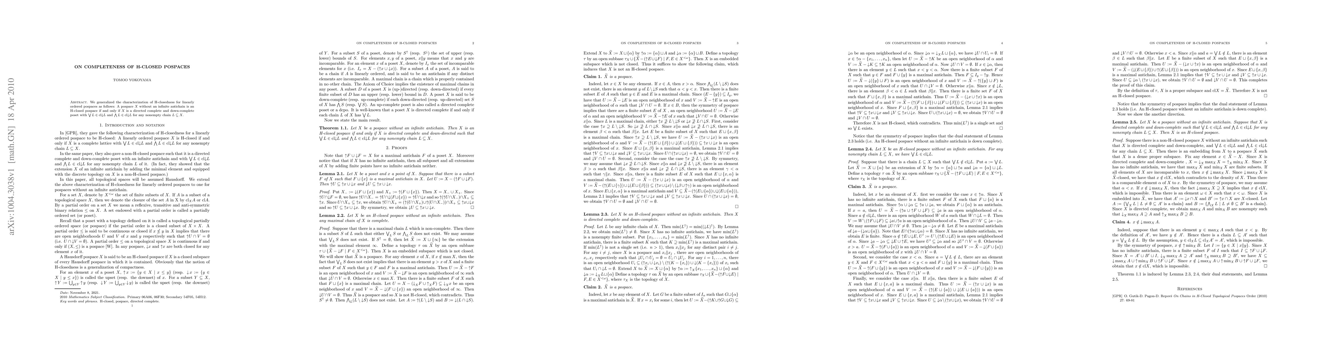 We generalized the characterization of H-closedness for linearly ordered pospaces as follows: A pospace $X$ without an infinite antichain is an H-closed pospace if and only if $X$ is a directed complete and down-complete poset such that sup $L$ and inf $L$ are contained in the closure of $L$ for any nonempty chain $L$ in $X$.