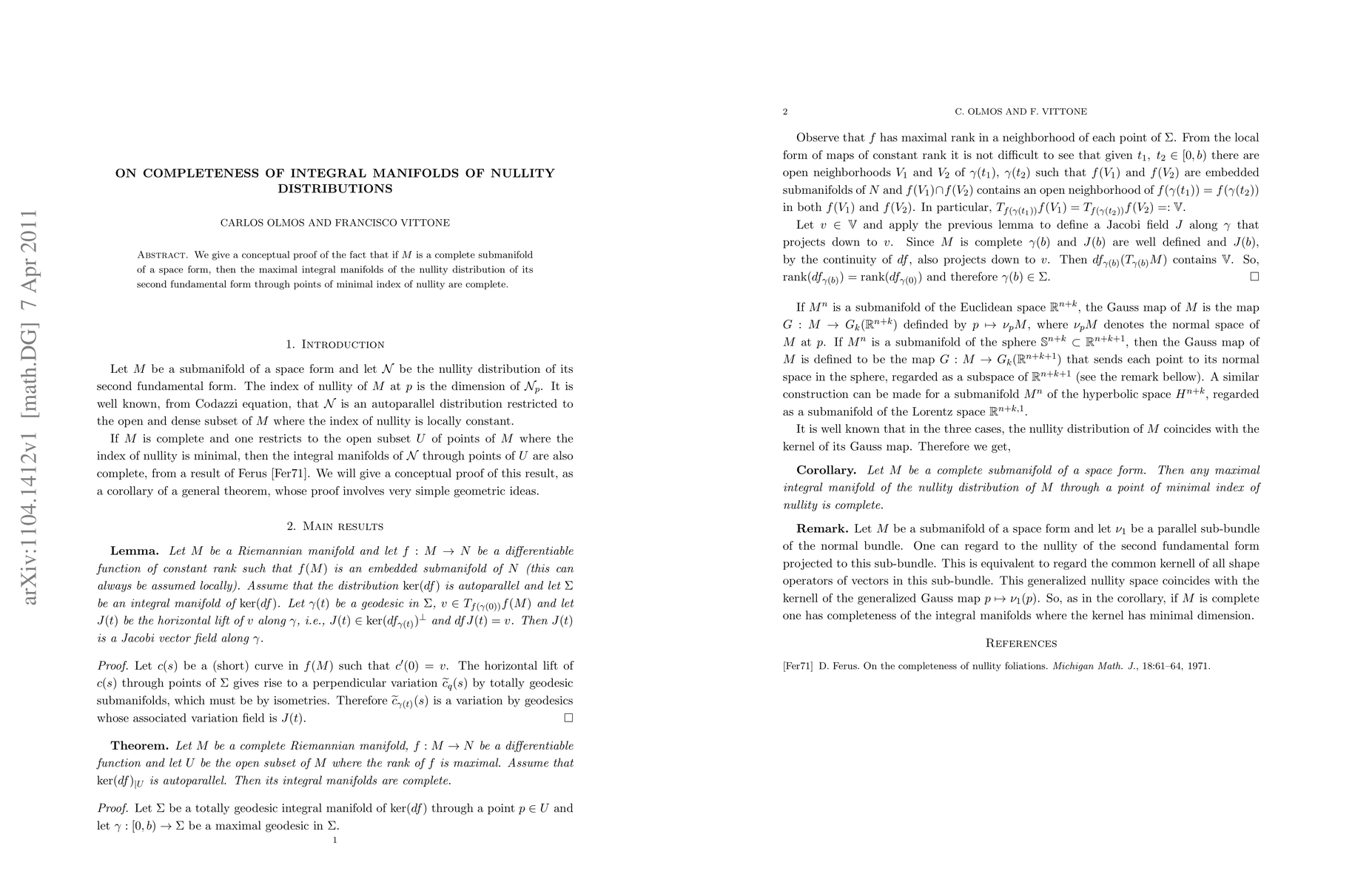 Summary: The paper provides a proof that maximal integral manifolds of the nullity distribution associated with the second fundamental form of a complete submanifold in a space form are also complete, particularly through points of minimal nullity index.