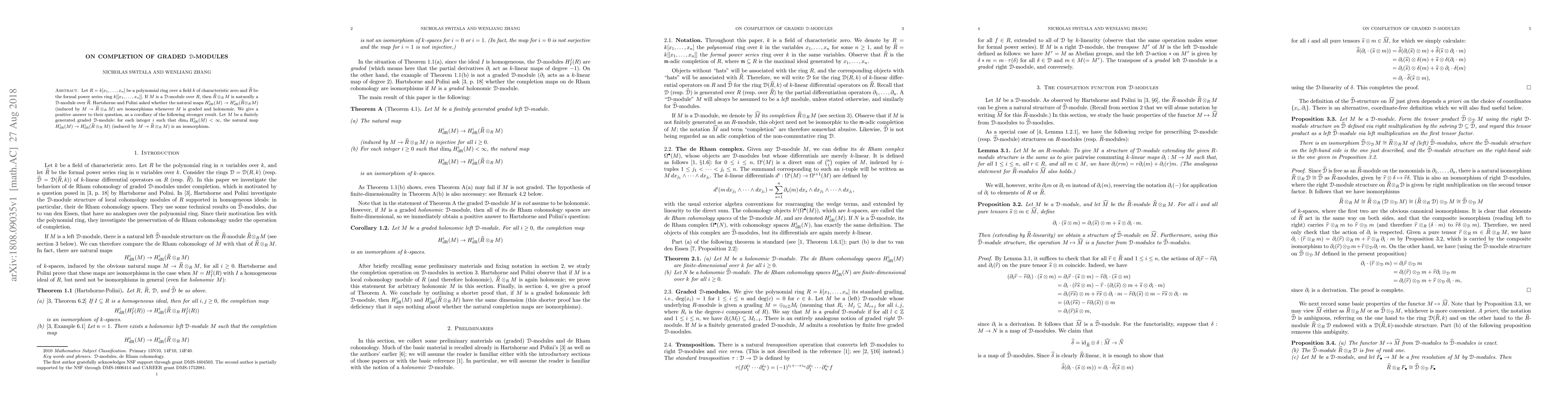 Let $R = k[x_1, \ldots, x_n]$ be a polynomial ring over a field $k$ of characteristic zero and $\cR$ be the formal power series ring $k[[x_1, \ldots, x_n]]$. If $M$ is a $\D$-module over $R$, then $\cR \otimes_R M$ is naturally a $\D$-module over $\cR$. Hartshorne and Polini asked whether the natural maps $H^i_{\dR}(M)\to H^i_{\dR}(\cR \otimes_R M)$ (induced by $M\to \cR \otimes_R M$) are isomorphisms whenever $M$ is graded and holonomic. We give a positive answer to their question, as a corollary of the following stronger result. Let $M$ be a finitely generated graded $\D$-module: for each integer $i$ such that $\dim_kH^i_{\dR}(M)<\infty$, the natural map $H^i_{\dR}(M)\to H^i_{\dR}(\cR \otimes_R M)$ (induced by $M\to \cR \otimes_R M$) is an isomorphism.