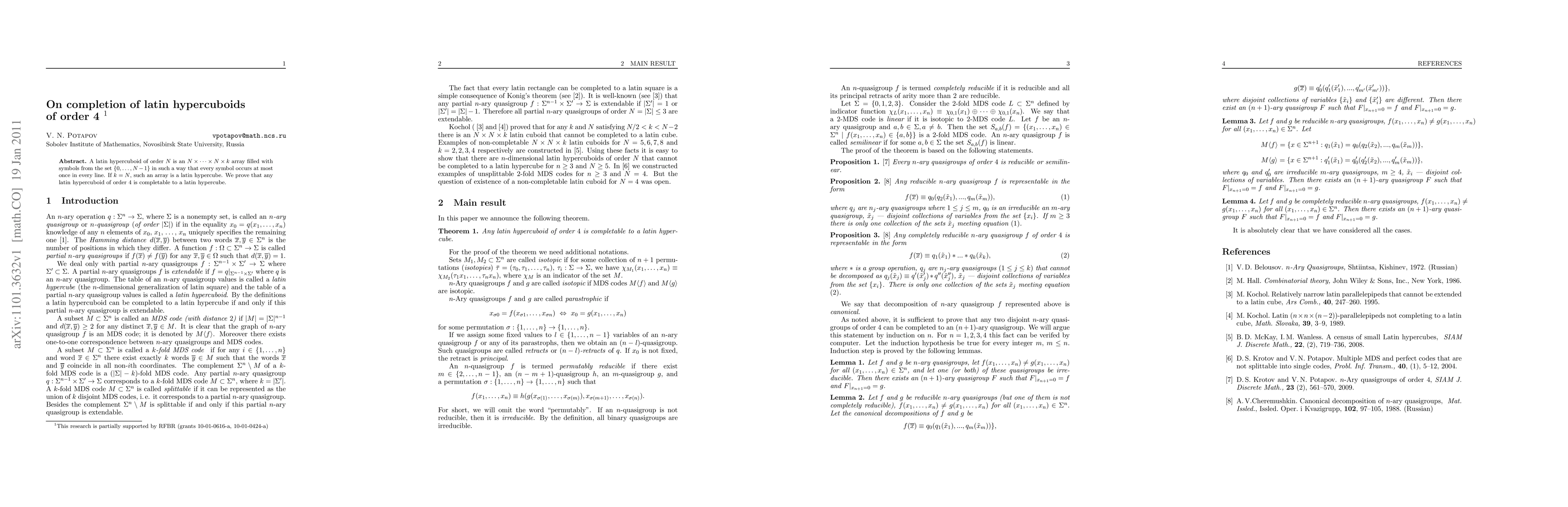 This research proves that any latin hypercuboid of order 4, an array filled with unique symbols in each line, can always be extended to form a latin hypercube, where each symbol appears exactly once across all dimensions.