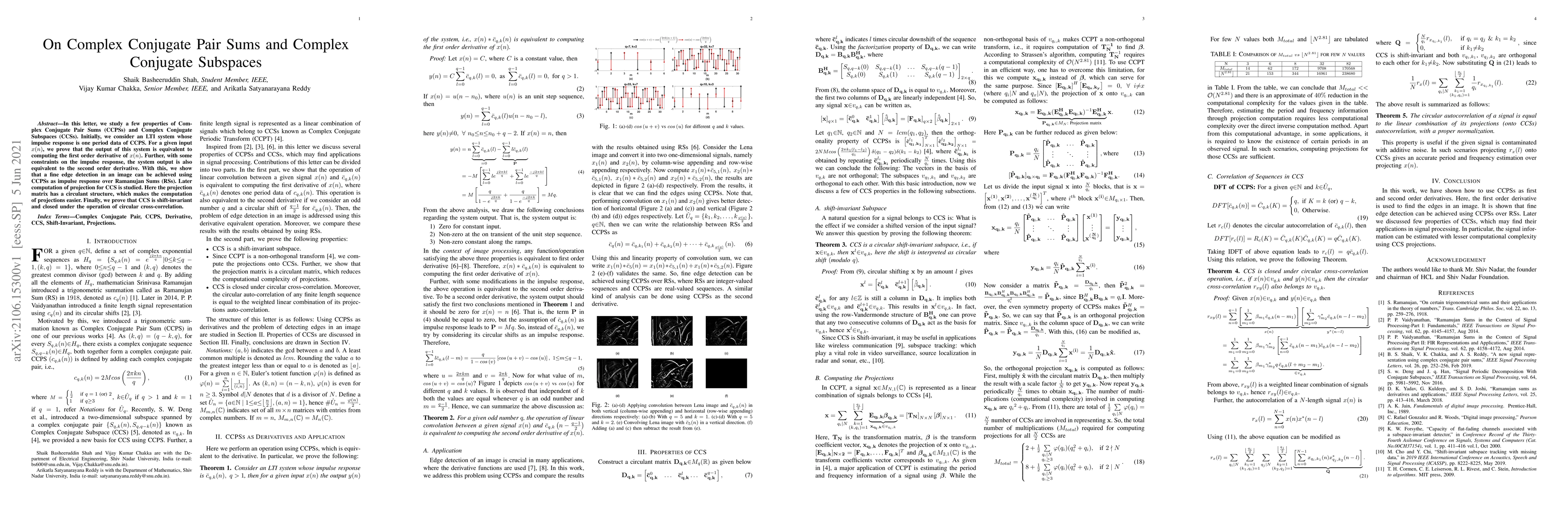 In this letter, we study a few properties of Complex Conjugate Pair Sums (CCPSs) and Complex Conjugate Subspaces (CCSs). Initially, we consider an LTI system whose impulse response is one period data of CCPS. For a given input x(n), we prove that the output of this system is equivalent to computing the first order derivative of x(n). Further, with some constraints on the impulse response, the system output is also equivalent to the second order derivative. With this, we show that a fine edge detection in an image can be achieved using CCPSs as impulse response over Ramanujan Sums (RSs). Later computation of projection for CCS is studied. Here the projection matrix has a circulant structure, which makes the computation of projections easier. Finally, we prove that CCS is shift-invariant and closed under the operation of circular cross-correlation.
