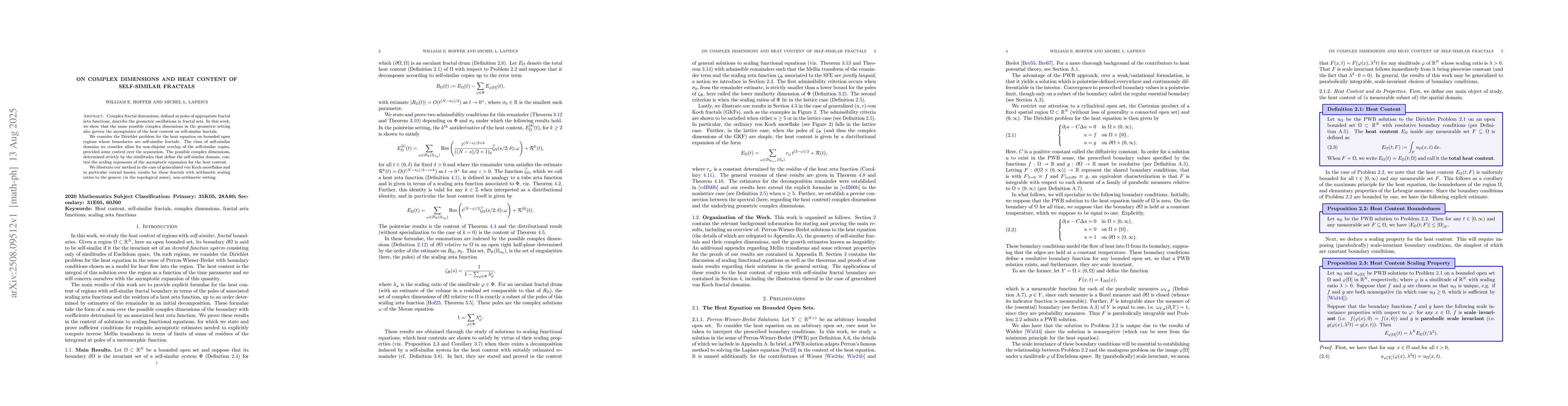 Complex fractal dimensions, defined as poles of appropriate fractal zeta functions, describe the geometric oscillations in fractal sets. In this work, we show that the same possible complex dimensions in the geometric setting also govern the asymptotics of the heat content on self-similar fractals. We consider the Dirichlet problem for the heat equation on bounded open regions whose boundaries are self-similar fractals. The class of self-similar domains we consider allow for non-disjoint overlap of the self-similar copies, provided some control over the separation. The possible complex dimensions, determined strictly by the similitudes that define the self-similar domain, control the scaling exponents of the asymptotic expansion for the heat content. We illustrate our method in the case of generalized von Koch snowflakes and in particular extend known results for these fractals with arithmetic scaling ratios to the generic (in the topological sense), non-arithmetic setting.