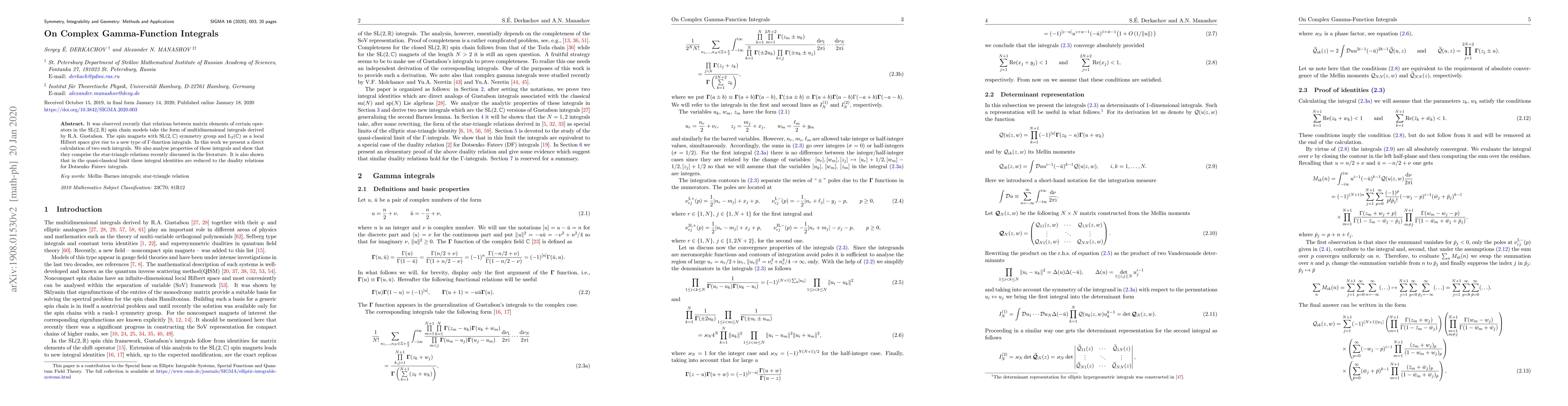 It was observed recently that relations between matrix elements of certain operators in the ${\rm SL}(2,\mathbb R)$ spin chain models take the form of multidimensional integrals derived by R.A. Gustafson. The spin magnets with ${\rm SL}(2,\mathbb C)$ symmetry group and ${\rm L}_2(\mathbb C)$ as a local Hilbert space give rise to a new type of $\Gamma$-function integrals. In this work we present a direct calculation of two such integrals. We also analyse properties of these integrals and show that they comprise the star-triangle relations recently discussed in the literature. It is also shown that in the quasi-classical limit these integral identities are reduced to the duality relations for Dotsenko-Fateev integrals.