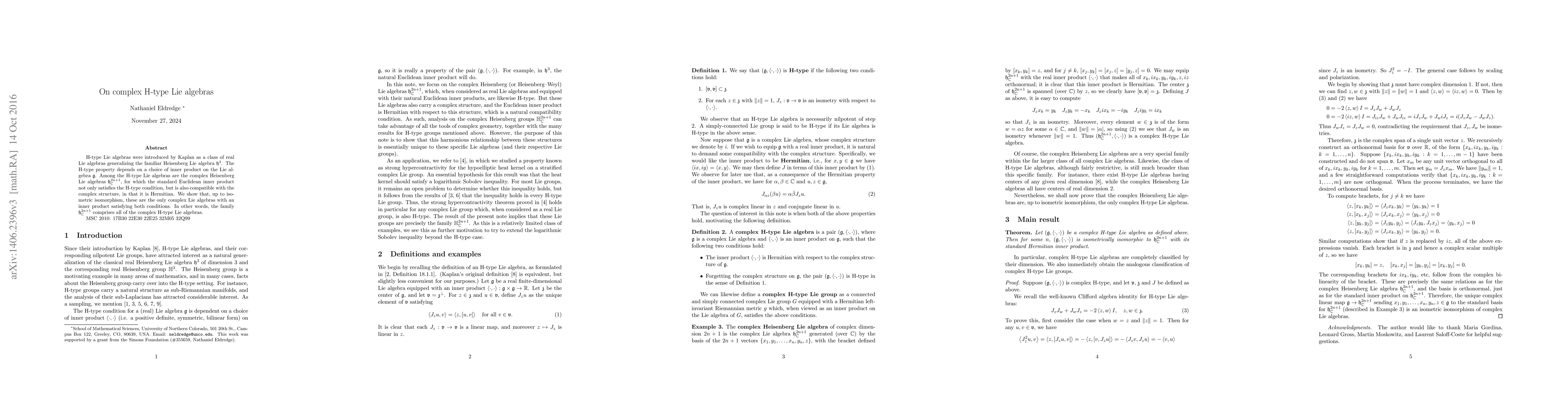 H-type Lie algebras were introduced by Kaplan as a class of real Lie algebras generalizing the familiar Heisenberg Lie algebra $\mathfrak{h}^3$. The H-type property depends on a choice of inner product on the Lie algebra $\mathfrak{g}$. Among the H-type Lie algebras are the complex Heisenberg Lie algebras $\mathfrak{h}^{2n+1}_{\mathbb{C}}$, for which the standard Euclidean inner product not only satisfies the H-type condition, but is also compatible with the complex structure, in that it is Hermitian. We show that, up to isometric isomorphism, these are the only complex Lie algebras with an inner product satisfying both conditions. In other words, the family $\mathfrak{h}^{2n+1}_{\mathbb{C}}$ comprises all of the complex H-type Lie algebras.