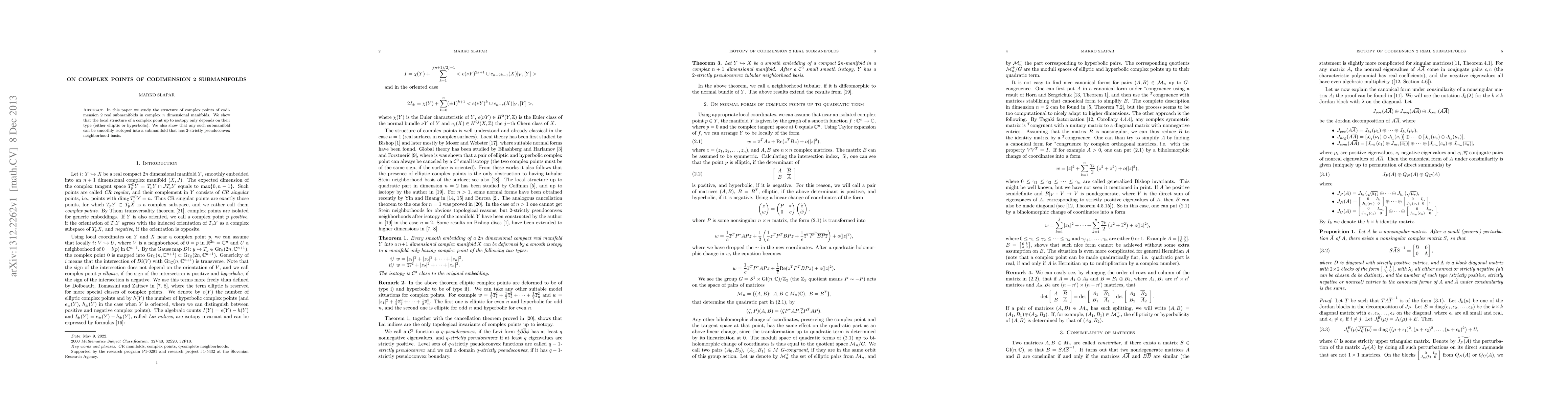 Summary: This paper investigates the local structure of complex points on codimension 2 submanifolds within complex manifolds, proving that their isotopy type depends solely on being elliptic or hyperbolic, and demonstrates that these submanifolds can be isotoped to have a 2-strictly pseudoconvex neighborhood basis.