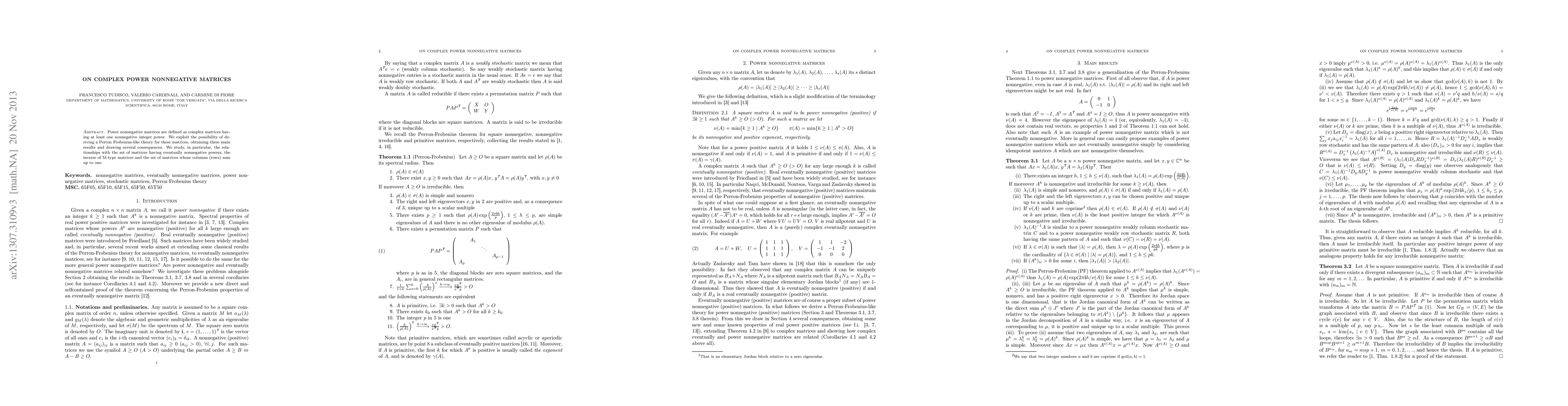Power nonnegative matrices are defined as complex matrices having at least one nonnegative integer power. We exploit the possibility of deriving a Perron Frobenius-like theory for these matrices, obtaining three main results and drawing several consequences. We study, in particular, the relationships with the set of matrices having eventually nonnegative powers, the inverse of M-type matrices and the set of matrices whose columns (rows) sum up to one.