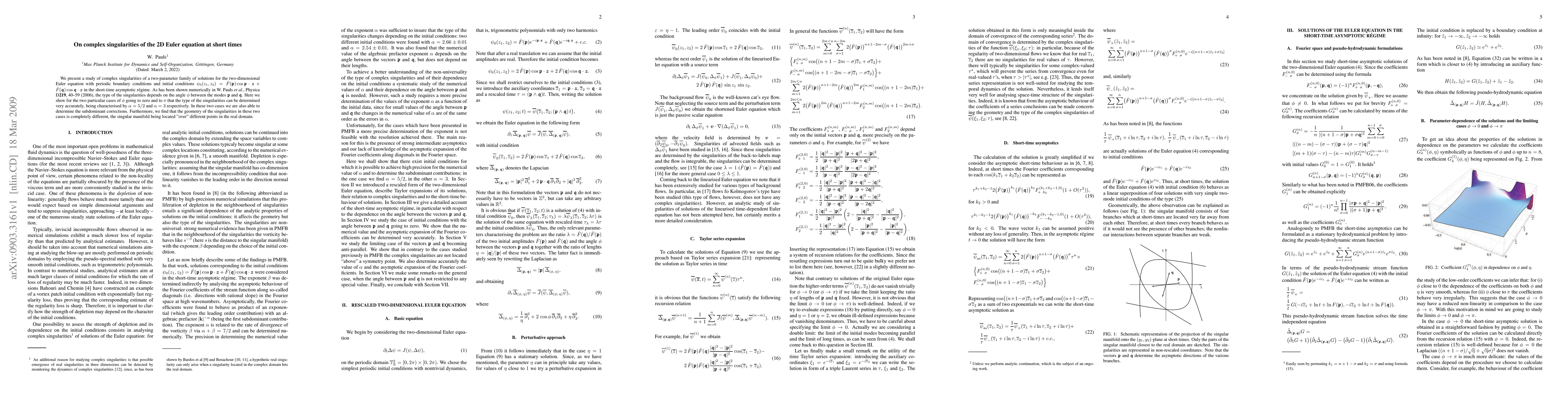 We present a study of complex singularities of a two-parameter family of solutions for the two-dimensional Euler equation with periodic boundary conditions and initial conditions F(p) cos p z + F(q) cos q z in the short-time asymptotic regime. As has been shown numerically in W. Pauls et al., Physica D 219, 40-59 (2006), the type of the singularities depends on the angle between the modes p and q. Here we show for the two particular cases of the angle going to zero and to pi that the type of the singularities can be determined very accurately, being characterised by the values 5/2 and 3 respectively. In these two cases we are also able to determine the subdominant corrections. Furthermore, we find that the geometry of the singularities in these two cases is completely different, the singular manifold being located "over" different points in the real domain.