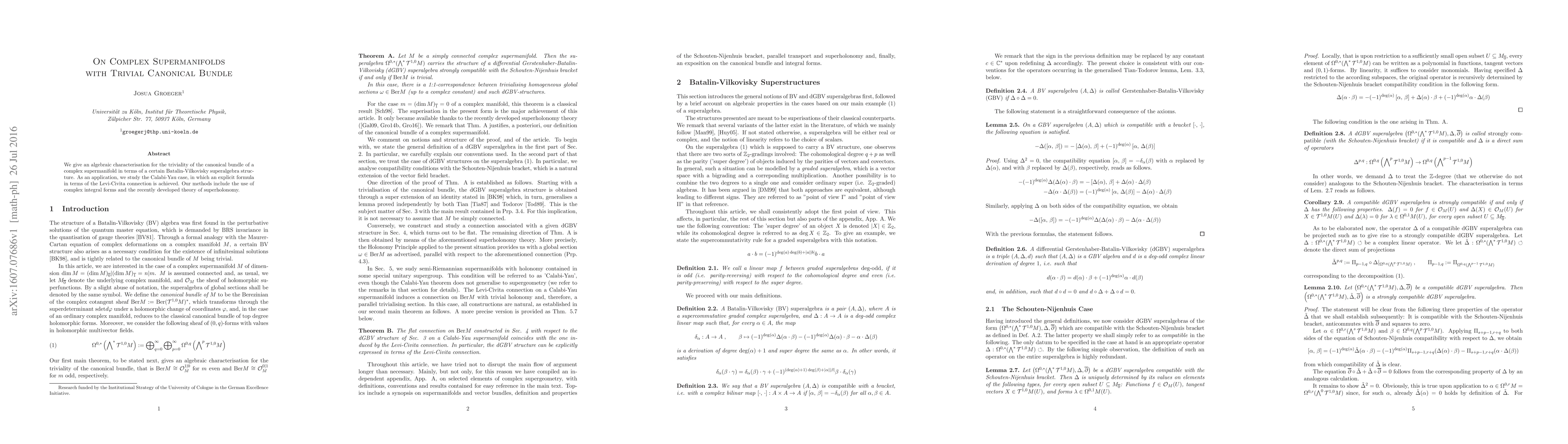 We give an algebraic characterisation for the triviality of the canonical bundle of a complex supermanifold in terms of a certain Batalin-Vilkovisky superalgebra structure. As an application, we study the Calabi-Yau case, in which an explicit formula in terms of the Levi-Civita connection is achieved. Our methods include the use of complex integral forms and the recently developed theory of superholonomy.