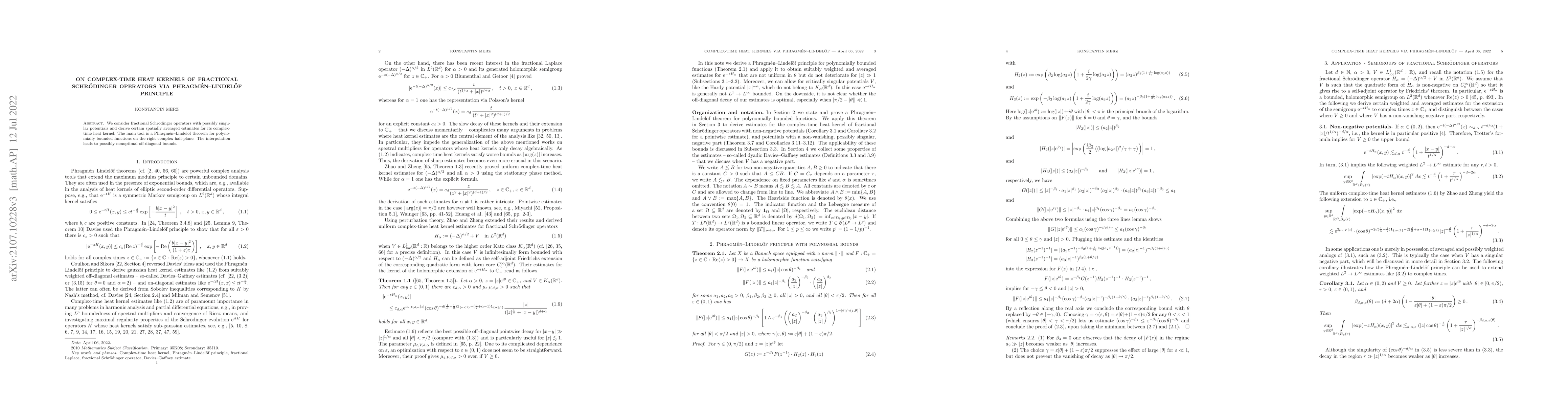 Summary: This paper derives spatially averaged estimates for the complex-time heat kernel of fractional Schrödinger operators with singular potentials, utilizing a Phragmén-Lindelöf theorem to achieve nonoptimal off-diagonal bounds.