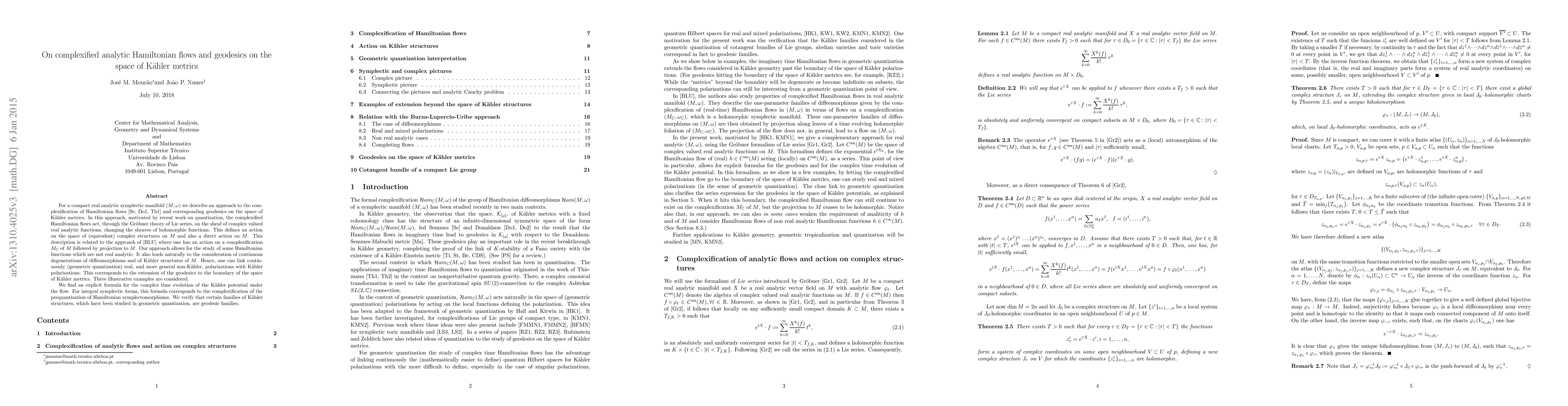 In the case of a compact real analytic symplectic manifold M we describe an approach to the complexification of Hamiltonian flows [Se, Do1, Th1] and corresponding geodesics on the space of Kahler metrics. In this approach, motivated by recent work on quantization, the complexified Hamiltonian flows act, through the Grobner theory of Lie series, on the sheaf of complex valued real analytic functions, changing the sheaves of holomorphic functions. This defines an action on the space of (equivalent) complex structures on M and also a direct action on M. This description is related to the approach of [BLU] where one has an action on a complexification M_C of M followed by projection to M. Our approach allows for the study of some Hamiltonian functions which are not real analytic. It also leads naturally to the consideration of continuous degenerations of diffeomorphisms and of Kahler structures of M. Hence, one can link continuously (geometric quantization) real, and more general non-Kahler, polarizations with Kahler polarizations. This corresponds to the extension of the geodesics to the boundary of the space of Kahler metrics. Three illustrative examples are considered. We find an explicit formula for the complex time evolution of the Kahler potential under the flow. For integral symplectic forms, this formula corresponds to the complexification of the prequantization of Hamiltonian symplectomorphisms. We verify that certain families of Kahler structures, which have been studied in geometric quantization, are geodesic families.