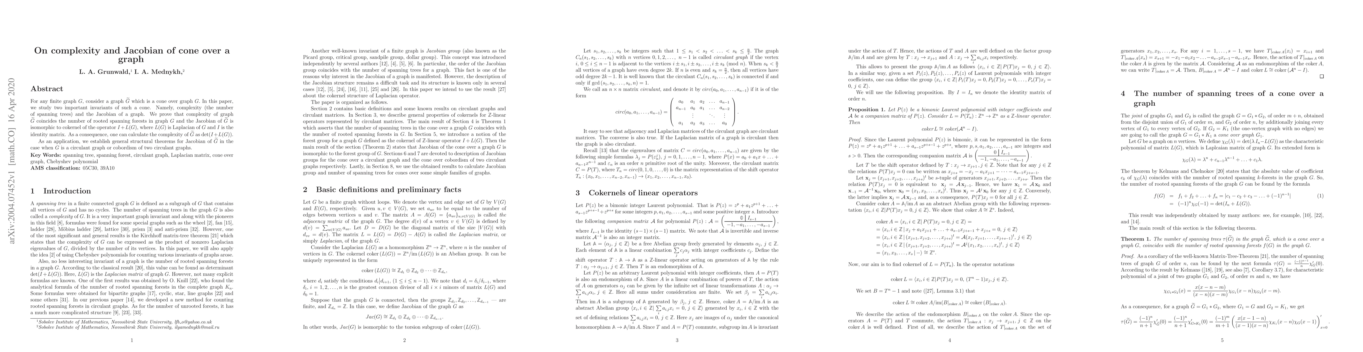 For any given graph $G$ consider a graph $\widetilde{G}$ which is a cone over graph $G.$ In this paper, we study two important invariants of such a cone. Namely, complexity (the number of spanning trees) and the Jacobian of a graph. We prove that complexity of graph $\widetilde{G}$ coincides the number of rooted spanning forests in graph $G$ and the Jacobian of $\widetilde{G}$ is isomorphic to cokernel of the operator $I+L(G),$ where $L(G)$ is Laplacian of $G$ and $I$ is the identity matrix. As a consequence, one can calculate the complexity of $\widetilde{G}$ as $\det(I+L(G)).$