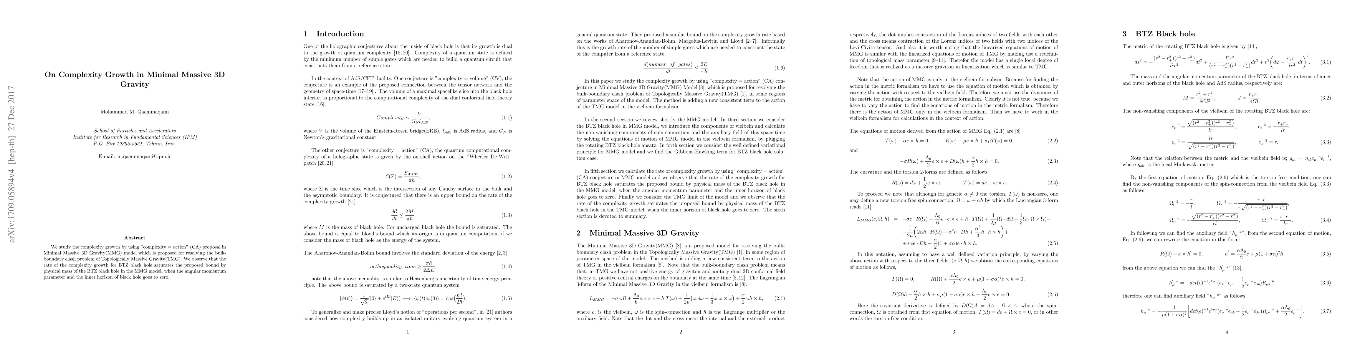 This paper investigates the complexity growth in Minimal Massive 3D Gravity (MMG) using the complexity = action (CA) proposal, finding that the complexity growth rate for BTZ black holes aligns with the physical mass bound when angular momentum and inner horizon vanish.
