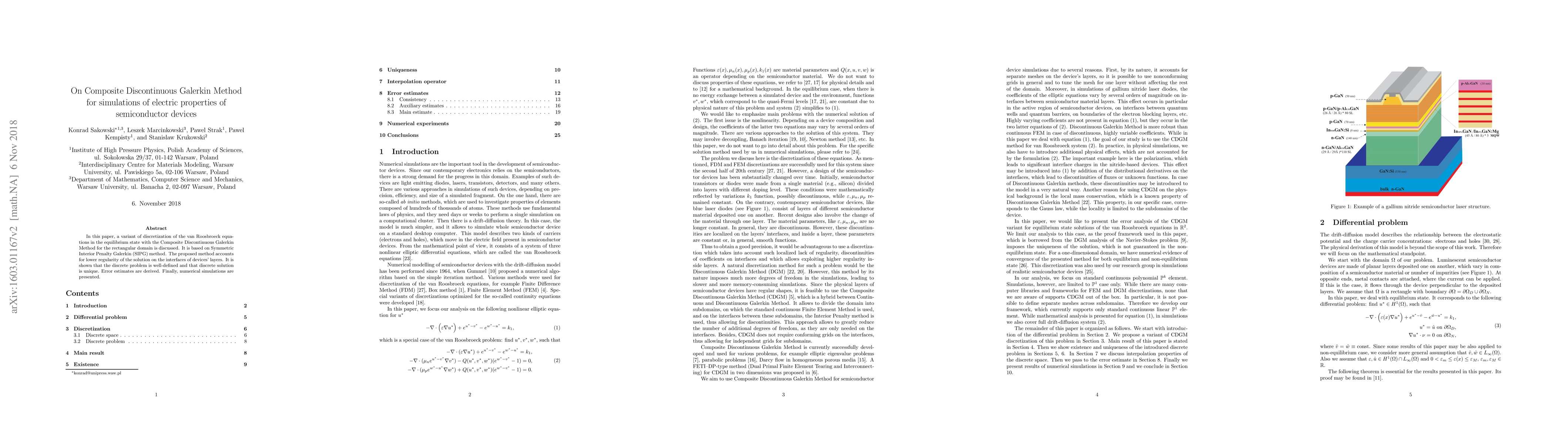 In this paper, a variant of discretization of the van Roosbroeck equations in the equilibrium state with the Composite Discontinuous Galerkin Method for the rectangular domain is discussed. It is based on Symmetric Interior Penalty Galerkin (SIPG) method. The proposed method accounts for lower regularity of the solution on the interfaces of devices' layers. It is shown that the discrete problem is well-defined and that discrete solution is unique. Error estimates are derived. Finally, numerical simulations are presented.
