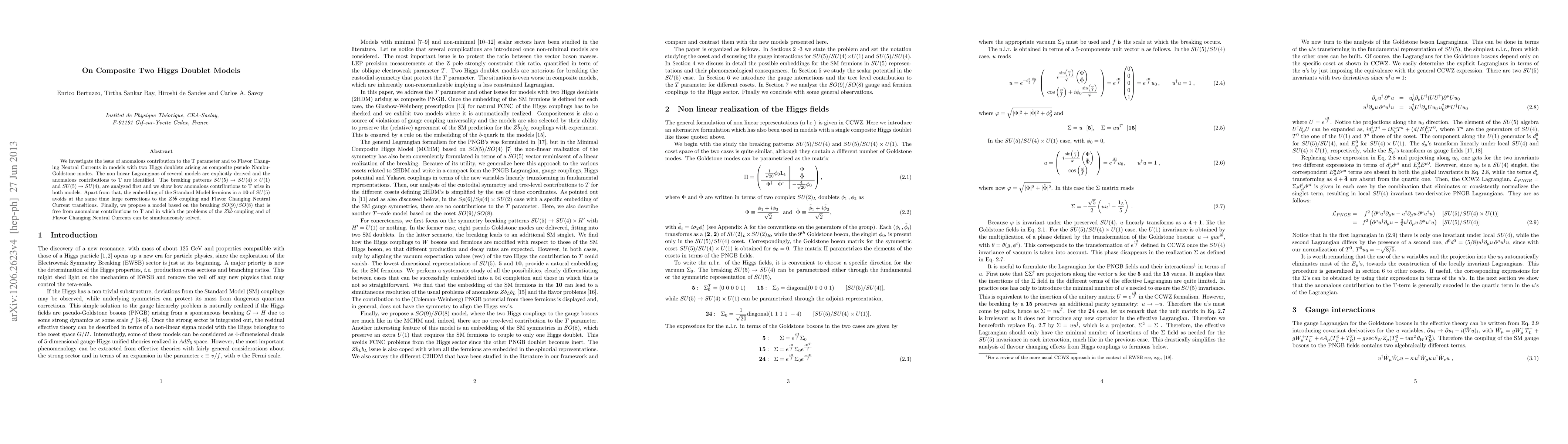 This paper explores composite two Higgs doublet models as pseudo Goldstone bosons from spontaneous symmetry breaking at the TeV scale, comparing SU(5) -> SU(4) x U(1) and SU(5) x SU(4) patterns. It addresses fermion representations to resolve Zb\bar{b} coupling anomalies and Flavor Changing Neutral Currents while detailing kinetic Lagrangians and T parameter contributions.