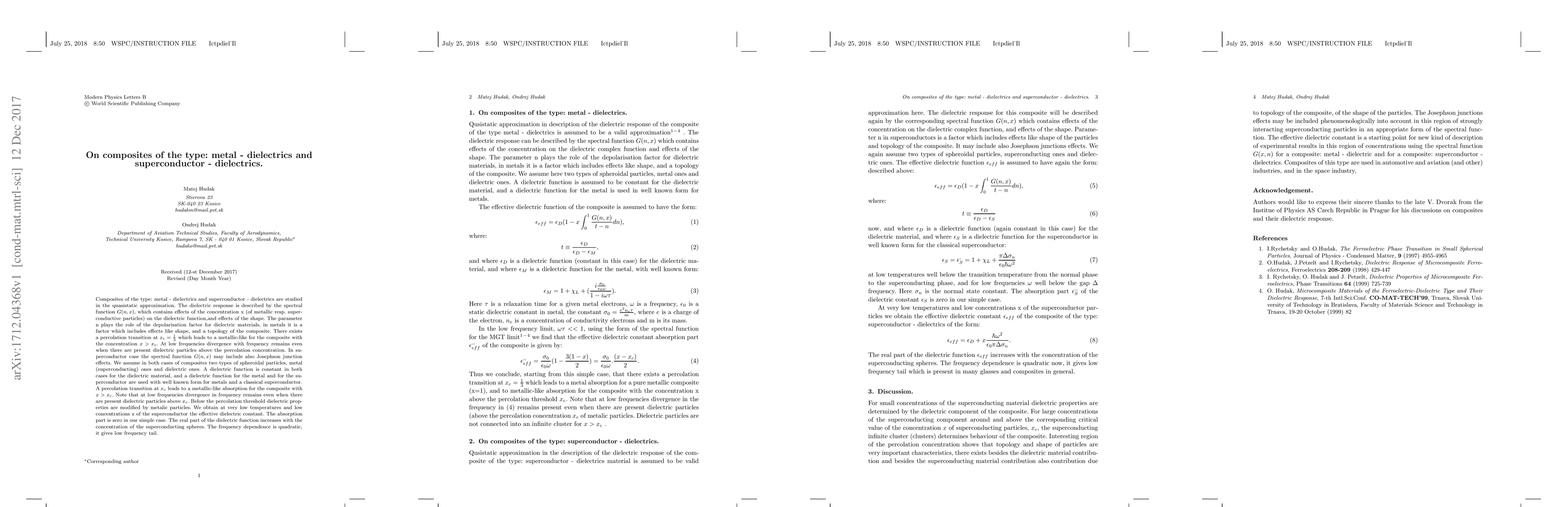 This paper investigates composites of metal-dielectrics and superconductor-dielectrics, focusing on their dielectric response and percolation transitions. It finds a percolation threshold at $x_{c}= \frac{1}{3}$ leading to metallic-like behavior above this concentration, with a low-frequency divergence persisting even with dielectric particles.