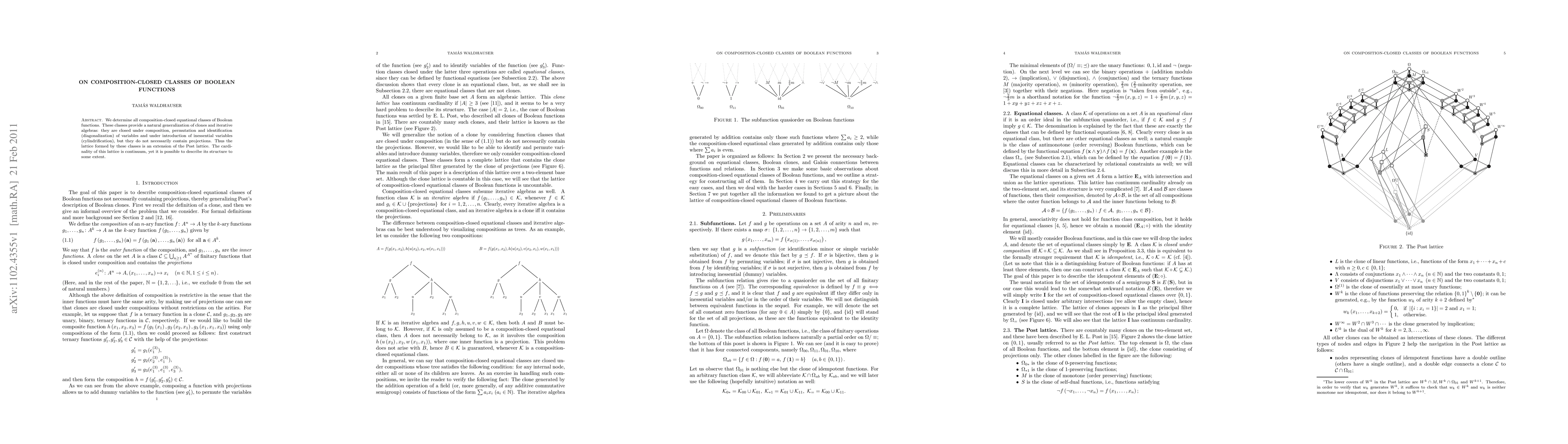 We determine all composition-closed equational classes of Boolean functions. These classes provide a natural generalization of clones and iterative algebras: they are closed under composition, permutation and identification (diagonalization) of variables and under introduction of inessential variables (cylindrification), but they do not necessarily contain projections. Thus the lattice formed by these classes is an extension of the Post lattice. The cardinality of this lattice is continuum, yet it is possible to describe its structure to some extent.
