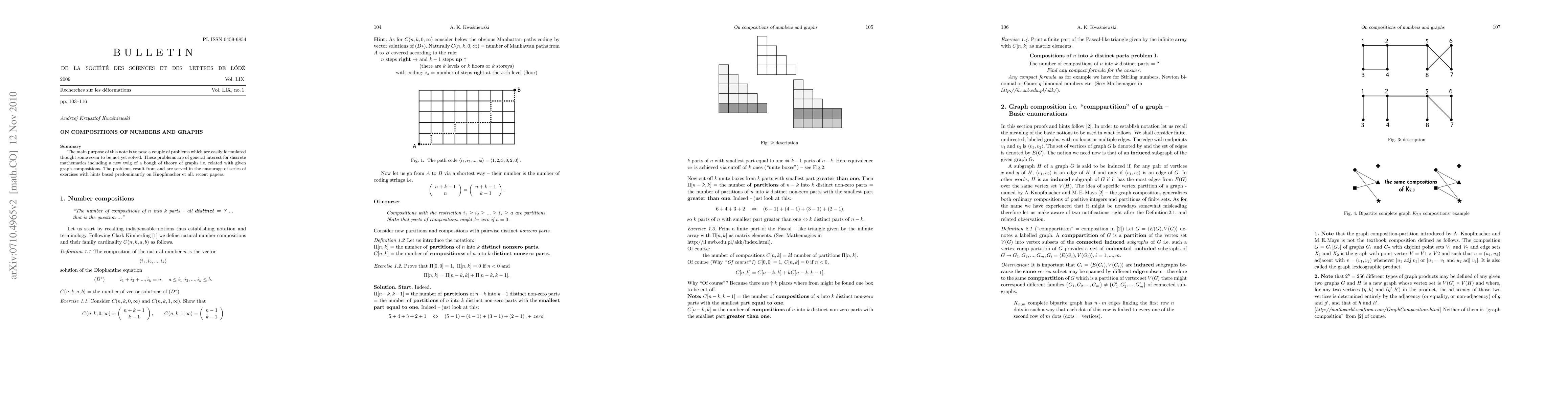 The main purpose of this note is to pose a couple of problems which are easily formulated thought some seem to be not yet solved. These problems are of general interest for discrete mathematics including a new twig of a bough of theory of graphs i.e. a given graph compositions. The problems result from and are served in the entourage of series of exercises with hints based predominantly on the second reference and other related recent papers.