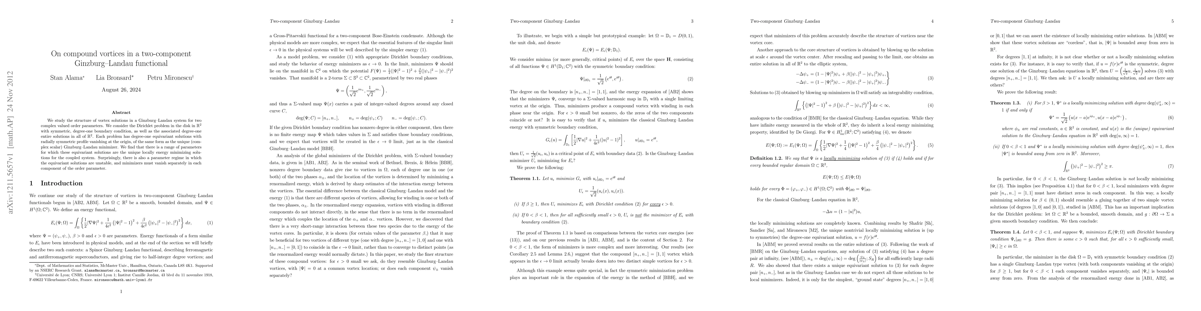 We study the structure of vortex solutions in a Ginzburg-Landau system for two complex valued order parameters. We consider the Dirichlet problem in the disk in R^2 with symmetric, degree-one boundary condition, as well as the associated degree-one entire solutions in all of R^2. Each problem has degree-one equivariant solutions with radially symmetric profile vanishing at the origin, of the same form as the unique (complex scalar) Ginzburg-Landau minimizer. We find that there is a range of parameters for which these equivariant solutions are the unique locally energy minimizing solutions for the coupled system. Surprisingly, there is also a parameter regime in which the equivariant solutions are unstable, and minimizers must vanish separately in each component of the order parameter.